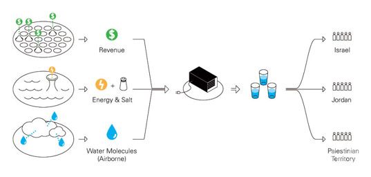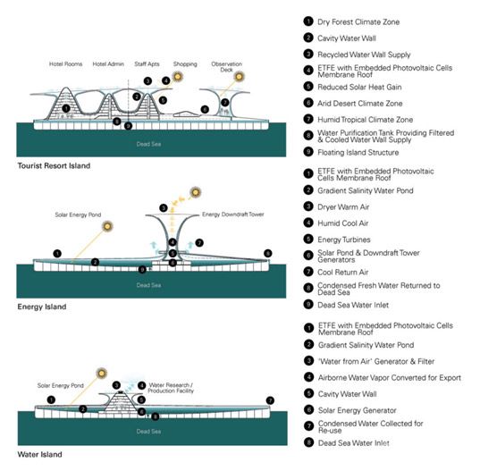 在死海地区,水是一切政治摩擦的根源,并且日渐破坏的生态环境也严重威胁着居民的饮用水供应。纽约建筑师Phu Hoang的一个研究计划或许将是一个解决水资源短缺的办法。这个再造水资源的项目将创造出可再生的能源,并且建成一个可以创造出淡水的人工海岛。这里将 成为集休闲、旅游为一体的胜地。也许当这个可创造淡水的人工海岛建成之时,这里将成为继迪拜之后的第二个世界旅游圣地,到那个时候,也许很多人将会选择到 这里来度假,到这里来享受漂浮在死海中的特别感觉。