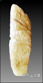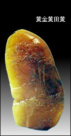寿山石在宝石和彩石学中,属彩石大类的岩石亚类,它的种属,石名很复杂,约有一百多个品种。按传统习惯寿山石的总目一般可分为“田坑”、“水坑” 和“山坑”三大类。 (一) 田坑石 合乎田坑石无根而璞,无脉可寻,呈自然块状,无明显棱角,它沉积于1-2米深的田地底,采掘艰难,多为当地农民在农闲时,翻田搜掘,偶然所得,故以稀有而见珍。 田黄石质极温润可爱,微透明或半透明,肌里隐隐可现罗卜状细纹,颜色外浓而向内逐渐变淡,石表有时裹黄色或灰黑色石皮,间有红色格纹,历有“石帝”、“石中之王”等美称。 田石按产地的不同,有上坂、中坂、下坂和礁下之分。田坑石的品种命名主要按色泽区分品种,辅之以石质产地。 田黄石:田黄石是田坑石中最常见的品种,凡黄色的田石均称“田黄”,以中坂田中所产质最佳。田黄石的表皮多具微透明黄色层,肌里则玲珑透彻,罗卜纹细而密,条理清晰,按质地的颜色可分多种,其中以“黄金黄”、“桔皮黄”最稀罕,“枇杷黄”、“桂花黄”次之,“桐油地”则色暗而质浊,属田石之下田。 田黄 田黄石 主要产于中坂田中 黄色、半透明、肌里隐现细罗卜纹; 田黄冻 田黄石中,质极通灵者; 银裹金田石 田黄石中,外裹白色层者;