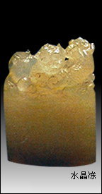 白田 白田石 主要产于上、中坂田中 色白,略带微黄,罗卜纹明显; 金裹银田石 白田石中,外裹黄色层者; 红田 桔皮红 主要产于上、中坂田中 色红如桔皮,鲜艳通明; 煨红田 外泛橙红色,裹层为黄色; 田黑皮 田上、中、下、坂均有 田黄石中外表有微透明黑色皮者; 纯黑田 主要产于下坂田中 黑赭色,微透明,罗卜纹较粗; 黑田 上、中、下坂均有 浅灰色,略带微黄,肌里含黑斑; 硬田 硬田 寿山村水田中 田坑石中质粗劣者; 搁溜田 搁溜田 寿山田埂旁 田坑石出露地面者; 溪菅田 溪菅田 寿山溪水中 田坑石经洪水冲荡流入溪中者; (二)水坑石 凡坑头各洞出产矿石,统称“水坑石”由于矿体地下水丰富,矿石受其浸蚀,多呈透明状,表面实有光泽,寿山石中各种“晶、冻”,多出于此。水坑石的品种命名,主要以色象形似而分定。 水晶冻 白水晶 坑头水晶冻 通体白色透明,肌里含棉花纹; 黄水晶 色如杏黄,通明纯正; 红水晶 色红艳,透明无瑕;