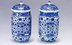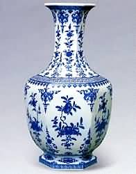 乾隆青花呈色稳定,早期与雍正时无甚区别,常有晕散出廓的现象,中期则 形成正蓝呈色明快的风格,晚期则呈色略显青灰。民窑中落斋堂款的,无论工艺或青花呈色,均可与官窑比美。乾隆青花瓷质早期与雍正基本一样,胎质洁白细润,晚期略显逊色,官窑与民窑无多大区别。釉面仍以青白色为主,匀净光润,也有呈粉白色的釉面,民窑中多见。微度的波浪釉偶有出现。浆胎青花康、雍、乾三朝均 有。 浆胎是指明、清两代用瓷土淘洗后的细泥浆制成的胎体轻薄、色如米浆的一种瓷胎。康、雍、乾浆胎青花自成一体。康熙时胎体微泛土黄色,釉面 多为粉白或浆白色,有细碎纹片,纹饰较一般青花细腻,底款多"大明成化年制"、"大明嘉靖年制"或秋叶等图记款识。雍正、乾隆时浆胎青花胎釉与康熙无大差 别,少数有釉面不太平整的,青花纹饰则渐趋规矩图案化。清晚期多仿康熙浆胎青花,但胎质粗松,呈灰白色,釉面多有杂质斑点,似感硬度不如真物而欠莹润。 乾隆青花纹饰题材丰富多彩,传统的人物、动物、植物均有,古祥图案到此时已规范化和普遍化,福、禄、寿寓意画及多子、登科、见喜等祈求美好愿望的心理,完全融于各种寓意的图案中,成为以后各代工匠创作的楷模。其他赞颂和粉饰太平的纹饰,如歌舞升平、安居乐业、人寿年丰等,则是乾隆统治60年的必然产物。因乾隆喜欢作诗,不少瓷器上也有他的诗作。但以青花书诗者较少,多是釉上彩作品。 清花缠枝莲纹如意耳蒜头口瓶 清乾隆 高23.2厘米 圆球形腹,仰覆莲瓣之间绘缠枝番莲;束颈,束颈口天突起一棱,上绘花朵纹,与圈纹相间,凸棱上下为缠枝纹与叶瓣纹;蒜头口上画缠枝莲,下承花瓣纹;圈足上回纹;底书"大清乾隆年制"六字篆体印章款。 青花折枝花果梅瓶 清乾隆 高32·5厘米 乾隆时悔瓶肩宽体胖,口颈相对厚高,主题纹饰折枝花果疏朗规矩,肩、腔绘莲瓣纹和蕉叶纹,略显程式化。此类作品在以后各朝延续不断,成为传统,但均不及此时的优秀。 青花花卉锦纹壮罐 (一对) 清乾隆 高28·5厘米 口底相若,腹部略大,呈高圆筒状。明宣德时始见,清乾隆时多有仿制。此对壮罐胎质细腻,通体绘花开锦纹,纹饰繁缠,意为繁花似锦。 青花折枝花果纹六方瓶 清乾隆 高66.5厘术 "大清乾隆年制"六字三行篆书款,乾隆本朝。六方形瓶体,造型周正,釉质肥厚润泽,青花色泽青翠。纹饰以肩为界,上部绘折枝花卉纹,下部绘折枝佛手、石榴、寿桃及花开纹,寓以"福禄寿"三多之意。绘画工艺精湛,图案雍容华贵。是乾降时期官窑青花的典型器物,瓶底有纹。 |
