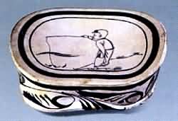磁州窑系是宋金时期北方最大的民窑系,以河北磁县磁州窑为中心,窑场在河北、河南、山西三省广有分布。江西吉州窑南宋时也烧造磁州窑系风格的瓷器。磁州窑系诸窑多是综合性瓷窑,兼烧白瓷、黑瓷、彩绘瓷、三彩陶器等品种。 白瓷是磁州窑的主要产品,造型以盘、碗最多见,也有瓶,罐、水盂、镜盒、玩具等。白瓷以其胎釉质地的不同,可以分为两类:一是仿定窑产品,胎土经过淘 洗,比较细密,胎色白或黄白,釉层较薄,釉质莹润,除底足外通体施釉,其中优质品与定瓷差别很小;另一类是粗白瓷,胎体厚重,胎质粗糙,呈土黄或红褐色,杂质明显,胎上有一层化妆土,多是内壁施满釉,外壁施半釉,有些器物外壁可以很清楚地看出瓷胎、化妆土、白釉3个层次。 黑瓷也是磁州窑产品的 大宗,这类产品的造型以罐、碗、瓶为主,也有盘、壶和玩具。胎质粗糙,胎色黄褐,胎体厚重,釉层较厚,黑色纯正。大多数器物是里施满釉、外施半釉,也有些 里外均施半釉,有些罐类内壁施釉仅过口沿。黑釉碗除纯黑者外,还有一些油滴、兔毫、玳瑁斑等窑变装饰。绿瓷产量不大,大都是金代产品,主要造型有盆、盘、瓶等。 釉下彩绘是磁州窑独具特色的装饰手法,以釉色分,有白釉釉下彩和绿釉釉下彩以彩色分,则有黑彩和褐彩图案,以花卉纹居多,如牡丹、荷花 等,也有一些动物图案,如鱼、蝴蝶、芦雁、鹭鸶等,还有少量龙、凤,人物很少见,主要是枕面上的婴戏图。宋代磁州窑的纹饰真切生动,具有生活情趣,最值得 一提的是瓷枕的枕面纹饰,除了常见的荷塘小景、风芦鸣鸟、竹菊牡丹以外,最精彩的是婴戏、马戏、动物等纹饰。此外还有大量的诗词歌赋、警句格言等。宋、金 磁州窑还生产三彩器,尤以金代为多。 磁州窑卧童 宋 长6·5厘米 童子呈伏卧状,身上以褐彩绘简洁的纹饰,面部表情生动,身仕比例匀称恰当,形象天真可爱,反映宋朝写实的审美取向及雕塑造型艺术的水平。 磁州窑白地黑花孩儿垂钓纹枕 北宋 29X22.lXl1。8厘米 枕呈椭圆形,枕面出檐,中间微内凹,平底露胎。枕面周边绘外粗内细的两道墨线,内画童子垂钓图。童子头梳刘海,身着紧袖长衣,手持鱼竿钓河中游鱼。 磁州窑剔花盖罐 宋 此罐丰肩鼓腹,至底渐收。胎骨厚重,形制硕大。通体施化妆土,其纹样是先在化妆土上划出轮廓线及细部,然后将花 纹以外的化妆土剔出,施透明釉高温一次烧成。图案醒目地凸出器表,白色的纹样与深色的胎色相互映衬,形成一种浮雕的装饰效果。主题纹样为缠枝花卉纹,腔部 饰莲花纹,图案布局严谨,易,刻花刀法娴熟,堪称一流。 |