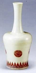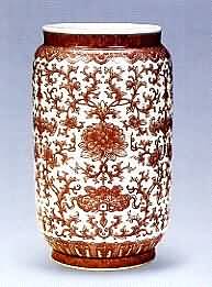明代洪武时釉里红瓷器较多,其造型纹饰有元代遗风,颜色浅红浅灰,很少有纯正的。宣德朝的釉里红烧制极为成功,形成了鲜艳的宝石红色。因对铜红釉烧造技术掌握较好,所以纹饰浓淡自如。值得注意的是,宣德釉里红瓷主要 采用涂抹法,洪武朝盛行的那种细线描绘图案的釉里红器,并不多见。常见纹饰有云龙、三鱼、三果。器型秀美,有高足碗,撇口碗等。其中釉里红三鱼高足碗,雍 正朝仿品很多,其中有一部分直书"大清雍正年制"官款,也有很大部分书"大明宣德年制"仿款。 清康熙釉里红仅次于当时的青花瓷,色调艳,纹饰 清楚。有的色较浓重,有的呈粉紫色。传世的康熙釉里红器,基本上都是官窑器,器型有盘、碗,梅瓶、油锤瓶,大缸,马蹄尊,苹果尊,摇铃尊,洗、金钟杯等。由于是官窑器,因此其图案也主要是龙纹,兽纹、团龙,团鹤团花、朵花,缠枝莲、三果等。釉里红器多数有"大清康熙年制"官款,部分有"大明宣德年制"等仿 明代年号款。 雍正釉里红的呈色技术进一步提高,和青花搭配时可做到运用自如。常见纹饰有三鱼、三果、五蝠,云鹤,松竹梅,缠枝花,凤穿花、山 水人物等。器型有梅瓶,天球瓶、高足碗、葫芦瓶等。其釉里红多数烧得十分成功,比康熙时更鲜艳,大多有"大清雍正年制"两行六字楷书青花款。雍正朝除白地 釉里红外,也还有青釉釉里红团龙、团凤器。乾隆釉里红大多红色偏淡,基本上和雍正釉里红色调一致,但雍正时有三鱼盘,碗及三果高足碗等极鲜艳红色的官窑 器,乾隆朝则十分鲜艳的极为少见。常见纹饰有团螭,团夔、折枝花果、云龙,龙凤等。清中期以后,釉里红瓷施釉稀薄,呈粉红色,釉面常见同时代瓷器上的"波 浪釉"。器型多见罐、瓶、盒、洗,盘之类。 釉里红菊花纹棱口大盘 明洪武 口径45.2更米 此盘折沿棱口,深腹,浅圈足,足墙外敛闪撇,整个造型宛如一朵盛开的莲花。盘口径近46厘米,虽具有元代瓷器造型硕大雄健的遗风,但已于浑厚中透露山秀美飘逸的气息。器身纹样以釉里红绘成,主题纹饰为菊花纹。釉质肥腴,白中微闪青灰,釉里红呈色红中偏灰。 釉里红福庆图壮罐 清乾隆 高21厘米 直口颈,肩以下至腔部呈直筒形,高圈足,外形上下对称,器形仿明永乐、宣德朝壮罐,罐内及底施白釉,釉色微微闪 青。外壁满绘5层纹样,上下4层为回纹、如意云纹、变形莲瓣纹、锦地纹,中间主题纹样是由并蒂莲、玉磐,蝙蝠组成的"福庆"百祥图案·乾隆时期宫窑很多仿 永乐、宣德器形,均不落款,壮罐亦属此类品种,非官窑莫属。 釉里红团凤摇铃尊 清康熙 高22厘米 "大清康熙年制"楷书款。此尊敞口长颈,端肩缩腹,浅圈足。胎体细密坚致,釉面纯净光润、白似含粉,釉里红发色纯正,纹饰疏朗,造型独特,是康熙官窑瓷器中的精品 |