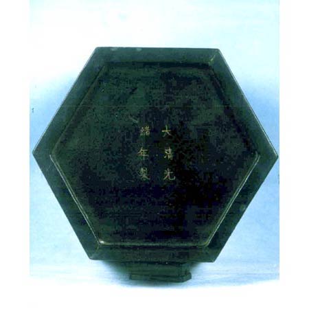 彩绘漆笔筒,笔筒六面,每面彩绘一龙,画面突起,漆地有蛇皮纹,底有“大清光绪年制”款。