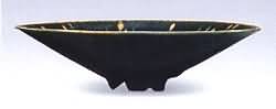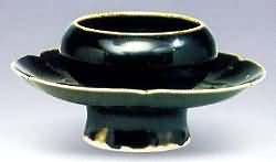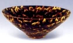 宋、金时期南北方都有黑瓷生产,产量比较大,器型主要是碗,盘、罐、坛、枕等,以碗的产量最大,这与宋朝的"斗茶"司俗有关。这些黑釉碗虽都以黑色釉为基本装饰,但经过特殊加工或窑变,形成了很多种类。 兔毫釉,即在黑色碗的里外壁上都有细长如丝毛状的斑纹,呈黄色或银白色,很像兔毛,故称兔毫釉。兔毫盏以建阳窑最著名。油滴釉,即在碗的黑色釉层中形成 一个个小圆点状结晶,有金黄色,也有银白色,很像油滴,故有此称。油滴盏也以建阳窑最佳。玳瑁斑,即在黑色釉层中窑变形成大小不等的斑块,有黄色,也有浅 蓝色,混合交织在一起,很像玳瑁的硬壳,故名玳瑁斑,多见于永和窑。 剪纸贴花,即在黑釉碗的内壁有对称排列的剪纸图案,剪纸图案部位与周围颜 色不同,系两次施釉而成。图案内容丰富,多成对出现,有飞凤、蝴蝶,还有开光式花卉。这种装饰方法唐时河北井径窑己有。木叶纹是在黑色釉中有一块黄色木叶 斑装饰,木叶筋脉纹路清晰可见,很像叶子飘落于碗中,这种方法为宋代吉州窑所创。 黑釉剔花,这种方法常见干北方,多施于瓶、罐一类外壁。黑釉 器物的装饰除以上儿种外,还有黑釉印花、黑釉金彩,黑釉彩斑等,但数量不多。宋朝生产黑瓷的窑口很多,以福建建窑和江西吉州窑质量最高。西夏境内出土的陶 瓷器以前多被定为北宋或金的产品,宁夏灵武磁堡窑址的调查发掘订正了史误。 建阳窑兔毫盏 宋 口径9·5厘米 釉器上透出黄棕色或铁锈色条纹,状如兔毫,谓兔毫斑。兔毫是黑釉的名贵品种,福建省很多瓷窑都烧制带兔毫纹的黑盏,以建阳窑的产品最著名。兔毫盏是建窑黑瓷中的名贵品种,极受收藏家珍视。 玳瑁釉斗笠碗 北宋 □径15.5匣米 玳瑁釉是吉州窑的产品,釉面黑、黄等色交织混合,釉面滋润,玳瑁釉器的坯体,系用含铁量较少的瓷工做成;生坯挂 釉,入窑焙烧后挂一次膨胀系数不同的釉,并重烧一次,由于釉层的龟裂、流动、密集、填缝,便在黑色中形成玳瑁状的斑纹,故称玳瑁釉。此碗口大微敛,深腹,至底渐收,小圈足。 定窑黑釉鹧鸪斑碗 北 宋 □径19匣米 鹧鸪斑也是一种结晶釉。用含铁量不同的两种黑釉,在生坯上挂釉两次,以稍低于烧制其他结晶釉的温度焙烧,因较多的铁元素在釉里结晶,黑色釉面便呈现鹧鸪羽毛一样的花纹,故名鹧鸪斑。 黑釉定窑葵口盏托 北宋 □径12·1匣米 盏托□沿呈葵花状,釉面滋润有光泽度。据记载,宋人把饮茶看做是一种高雅的享受,上至朝廷皇室,下至文人学士都讲究饮茶,并有一套繁琐的规程礼节,因黑釉盏最便于衬托和观察茶色,因而受到斗茶者的喜爱。同时,皇室的青睐也促进了黑釉茶盏的生产。 |