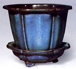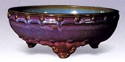 元代制瓷业是宋,金制瓷业的继续和发展。元瓷夹在宋和明清两个制瓷 业高峰之间,过渡性十分明显。一方面,宋、金时期的一些名窑,如磁州窑、钧窑,景德镇窑,龙泉窑的传统产品仍在继续烧造,特别是龙泉,青白系诸窑,由于外 销的需要,大件器型增多,生产规模普遍扩大;另一方面,元代中晚期景德镇又正式烧出了青花,釉里红,钴蓝釉,铜红釉,卵白釉等新品种,为它日后成为瓷都奠 定了基础。钧窑 元朝统治时期,北方定窑、耀州窑巳经走向衰落,钧窑和磁州窑则继续发展。 元代钧窑系的烧造中心仍是河南禹县。这时期钧瓷的影响比宋朝还大,烧钧瓷的窑口在河南广有分布,河北、山西也有,形成了一个钧窑体系。和宋、金不同的是 元钧瓷的胎子更厚,更粗糙、疏松,有砂粒及砂眼,胎子颜色深灰或土黄。胎釉结合不如宋钧紧密,釉子胳粗,有大气泡和棕眼。颜色一般是月白色或蓝灰色,个别 器物上有紫红色彩斑,是人工有意涂抹而不是釉中所含铜元素在高温中的自然晕散。釉厚,自然垂流多不到底,底足无釉,露深黄色或浅褐色胎。 元钧瓷一般光素无纹,炉、罐、瓶等立器有的模印贴花或堆塑纹饰,纹饰模糊不清。元钧瓷常见有盘、碗、罐、炉、瓶、盆等。碗多敛口,收腹,小圈足,底足心有旋削残留的鸡心凸起。炉多直口或浅盘口,直颈,鼓腹,有3个小尖足或兽足,有的有耳。 与宋代钧窑瓷器相比,元代钧窑瓷器流传后世的数量要多,但其价值与宋钧却相差很大,主要是因为元钧瓷胎质粗松,釉色僵硬,存世量多。 钧窑天蓝釉大罐 元 高27·5厘米 此罐大□,短颈,丰肩,腹上部外鼓,至底渐收,圈足。通体施天蓝釉,釉色光亮,但胎质不如宋时致密,胎壁较厚。 钧窑玫瑰紫蓝釉鼓钉水仙盆 元 直径25·3厘米 此盆大口平沿,弧形腹,器身作鼓式,下承三如意形扁足。外口沿及胆部分别饰鼓钉纹及弦纹,形制规整端庄,纹样简练古朴。器外饰玫瑰紫釉,内为天蓝釉,底刷酱色釉,有支钉痕。 钧窑天蓝釉葵花式花盆及盆托 元 直径22·2厘米 此盆折沿,边棱微凸,深腹,圈足。口、腹、足部的楞线外凹内凸,整体呈瓣状菱花形,形制工满华丽。盆外壁施玫瑰红釉,盆内边和口沿为紫红釉,内壁为天蓝釉。钧红釉釉面棕眼密集,其间掺杂着许多细小的黑疵点。盆托边沿呈葵花形,三足。 |