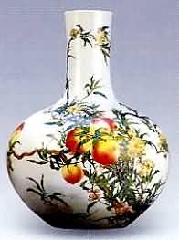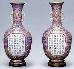 粉彩是乾隆朝瓷器中所占此重较大的品种之一,在雍正瓷的基础上又 有新的突破。乾隆粉彩中的一部分继承了雍正时期在肥润的白釉上绘疏朗艳丽纹饰的特点,如常见的折枝花卉盘、碗、小瓶、面盆、人物笔筒和大件器物鹿头尊等。鹿头尊是乾隆时常见品种。其口直,口以下渐大,垂腹收底,圈足。尊的上半部饰两个搂雕的夔凤耳、蟠螭耳或鹿头耳,因器型像倒过来的牛头或鹿头而得名。鹿头 尊多在白地上绘青山绿水、树木,山水间及丛林里有很多头梅花鹿或奔跑或立,或回首或低头,颜色鲜亮,层次清晰,布局疏密有致。这类瓷也有叫百鹿尊的。乾隆 朝的这一品种流传下来的巳经很少了,大多是光绪朝仿的,层次不清,颜色暗谈。 乾隆朝除了白地绘份彩外,还有色地粉彩或色地开光中绘粉彩等品 种。乾隆朝粉彩的创新品种是在黄、绿、红、粉、蓝等色地上用极细的工具轧出缠枝忍冬或缠枝蔓草等延绵不断的纹饰,且多和开光一起使用,人称轧道开光。这一 工艺的出现,将粉彩推上了更加富丽繁缛的顶峰,一直延续到民国。另外,乾隆朝还有部分在粉彩瓷器的内壁及底足内施绿彩,俗称"绿里绿底",一直流行到清 末、民国。乾隆朝的"绿里绿底"极浅淡,迎光侧看釉面有极细小的皱纹,像微风吹过平静的湖面而形成的细波。绿彩附着在白釉上非常紧密,几乎没有爆釉现象。乾隆朝粉彩的常见纹饰有山水、婴戏、九桃、瓜蝶、百鹿、花鸟、仕女、百花 (亦称 "百花不露地")、八仙、云蝠、福寿、缠枝花、皮球花、花蝶等。除了常见的器型以外,新颖造型还有贲巴壶、交泰瓶、转颈瓶。款识有青花、红彩、金彩等种类。 粉彩喜鹊登梅大天球瓶 清乾隆 高56厘米 估价:RMB200000一350000 "大清乾隆年制"六字三行篆书款。瓶颈笔直修长,球形腹浑圆,气势宏伟壮观。通体以粉彩绘有喜鹊登梅图,12只 喜鹊姿态各异地栖憩在梅花枝于上,深、浅两道枝干,红、白两色梅花,以及浓艳的灵芝、青翠的兰花,寓意着春天的到来,喜事的降临。"喜鹊登梅"是中国民间 最为喜闻乐见的吉祥喜庆图案。天球瓶工艺精湛,色彩艳丽,保存完好,传世品中十分少见。 粉彩开光御题诗文壁瓶 (一对) 清乾隆 高21.5厘米 估价:RMB200000一400000 "乾隆年制"四字一行篆书款,乾隆本朝。壁瓶以肥脂红釉为地,上绘万福花卉图案,腹部开光、内以墨彩书乾隆御题 诗文,尾落 "乾隆癸亥御题"及红彩"乾隆"印章纹,底足为仿木座形式,并以全彩装饰。根据清宫档案记载,此对瓶应为乾隆八年(1743)景德镇督陶官唐英奉旨烧制一 批壁瓶中的一对。壁瓶制作精细、色泽典雅,御题诗帛写工整,保存完好至今,十万难得。瓶背原配有红木托保护。 粉彩九桃五蝠天球瓶 清乾隆 高50厘米 估价:RMBl200000一1500000 成交价:RMB2179400 造型硕大挺拔,彩绘技法娴熟,画工精细工整。天球瓶造型始于明永乐时期,雍正、乾隆时再度盛行,以"彩绘"纹 者,是雍正、乾隆官窑的标准器物,绘九桃的,惟乾隆官窑最具代表性。桃在中国传统文化中是一种吉祥之物。传说桃木可驱鬼,桃实食之则可延年益寿,遂成为长 寿的象征。"九"在中国传统文化中则是至尊之数,九桃绘于瓶上,再川上5个蝙蝠,寓意平安祥顺,万寿无疆。 粉彩镂空六角套瓶 清乾隆 高40·6星米 成交价:RMB22201400 六方体,折口,直颈端肩,直腹下收,高足外撇。通体在各种颜色地上用粉彩、金银彩,绘灵芝、卷草、蕉叶、蝠、蝶、花卉,腹部开光镂空雕粉彩花卉,内层以青花绘缠枝花纹,吸收西洋画技法,纹饰亦有西方情调,加之造型高大,抬体厚重坚致,工艺复杂,是乾隆官窑不可多 得的精品。 |