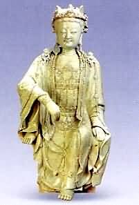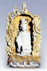 元代青白瓷的生产中心仍在江西景德镇。江西其他地区及福建、广东 也都有生产,故有“江河川广器尚青白”之说。元代青白瓷的胎釉特征与宋代有所不同:瓷胎采用高岭土加瓷土的"二元配方"法,胎土中氧化铝的含量增加,烧成 温度更高,胎质更白,器物很少变形。釉为石灰----碱釉,即在釉料中掺人适量的草木灰,使釉中含有碱金属钾和钠,同时降低氧化钙的含量。由于釉的黏度提 高,不易流淌,烧成后釉面失透,光泽柔和,釉色比宋代略白,但不如宋影青的玉质感强烈。器物造型除碗、盘、瓶、炉、罐、枕外,还新出现了扁型执壶、葫芦形 执壶、多棱壶、笔架山、动物形砚滴等。造型特点是厚重饱满,由于器物胎壁加厚,显得釉层较薄。元代青白瓷比较注重装饰,普遍采用印花、刻花、划花技法,其 中以刻印串珠纹最有特色。此外还有褐色彩斑装饰。 卵白釉瓷是元代景德镇烧成的一个白瓷品种,常有人误称为"影青"。它的特点是:怡体厚 重,怡质坚硬细密,釉面失透,釉色白中微泛青,如卵白色。卵白釉瓷器多为小件器,如浅式盘、折腰碗、高足碗等,造型特征是小圈足,足壁厚,削足规整,底心 常有小乳钉状突起。装饰方法主要是内壁印花,以缠枝花卉最常见,也有少量龙纹,有的因为釉子很厚,故纹饰模糊,不甚清晰。很多盘碗在内壁口沿处相对印"枢 府"二宇款,传世品中还有"太禧"款,均为楷书,这类器物又被称为"枢府器"。"枢府"是元代军事机构枢密院的简称,"太禧"是元代专掌祭祖之职的"太禧 宗禅院"的简称,带这类款识的应是元代官府定做或征用的瓷器。由于这类瓷器制作精细,又有官府名称,加之所印云龙纹饰均为五爪龙,被后人认为是元代官窑的 产品。无论是否官窑所产,元代烧制白瓷的成功经验,为以后釉下、釉上彩绘瓷的高度发展,奠定了坚实的基础。 枢府窑凸花盘 (一对) 元 直径 13·5厘米 估 价 :RMB30000一50000成交价 :RMB26400 枢府款 青白瓷观音坐像龛 元 高20·6厘米 估价:RMB70000一90000 观音脸庞丰满圆润,神态安详,衣裙线条流畅。通体施青白釉,釉色光泽柔和。 青白釉观音坐像 元 高65厘米 坐像胎体由三块组成,头部、腰际接痕明显。通体施青白釉,晶润光洁,如冰似玉。观音体态硕壮,广额丰颐,面部塑造极为传神,胎体的帔帛、长裙线条流畅,衬托出优美的形体,是元代景德镇瓷塑艺术的杰作。 |