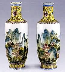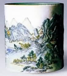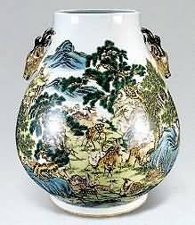 嘉庆朝彩瓷以粉彩为主流,陈设器、文房用具、日用器皿以及五供 (由两件香罐、两件花抓及一件香炉组成) 和法器等都属常见。嘉庆早期的粉彩还有乾隆朝的特点,比较精细,既有"百花不露地"的,也有彩地轧道开光的。"百花不露地"相当精细,个别的甚至是"金地 百花";彩地轧道开光品种的不如乾隆时的精细规整,所绘纹饰有的也显呆滞。嘉庆粉彩瓷常见纹饰有花卉、八宝、云龙、罗汉、婴戏、石榴等。器型有瓶、笔筒、洗、盘、碗、茶壶、戟耳瓶等。粉彩器中有部分器物的内壁和底部施豆瓣绿釉,压凤尾纹粉彩器则仍多见各种色地,如黄、红、绿等。这一时期描金工艺的采用也较 为普遍。 总的来说,嘉庆朝粉彩的特征有以下几点:一是官窑器中的粉彩开光器为多见;二是继承乾隆制作的压凤尾纹(即轧道工艺)粉彩仍属多 见;三是万花堆、百花图画面的器物十分突出;四是在碗类器上也出现了山川风景画;五是碗、盘之类器物的图案以花卉、花果为多,特别突出的是过枝癞瓜的图 案,象征着瓜瓞绵绵的吉祥之意。 道光朝彩瓷,除了白地粉彩器外,所见有各种色地开光粉彩,而且往往和描金工艺结合。器物除瓶、罐及少量文房用 具外,大量的是碗盘等日用器皿,图案以荷花、癞瓜和婴戏图、清装仕女以及各种花蝶虫草为突出。亦常见 "吉庆有余"、"麻姑献寿"、"太平有象"等吉祥题材,其中凡属"慎德堂制"、"懈竹主人造"及"种德堂制"款的粉彩器,大多都比较精致。 道光朝粉彩瓷类同于嘉庆朝,只是绘瓜蝶、草虫纹饰的略精。署"慎德堂"款的粉彩器是道光皇帝的私人堂款,相当于官窑器,其工艺精湛,主要器型有瓶、罐、花盆、盘、碗、灯笼尊、盖碗等。 粉彩描金冰梅盘 清道光 直径12·8厘米 "经笥堂制"四字行楷书款,道光时期。口微撇,浅壁,圈足。盘内外以金彩绘冰裂纹,粉彩绘梅花,图案雅丽,色泽柔和。 粉彩缠枝花瓣玉壶春 清嘉庆 高27·5厘米 撇口,细长颈,溜肩,鼓腹,呈圆球形,圈足稍向外侈,线条圆润挺劲,秀丽之口透着一种入骨的俏丽柔媚。瓷质清刚,釉色幽倩,器形取法宋代;器身绘满缠枝花卉,纹饰密而不繁,素雅大方,造型匀称和谐。 粉彩山水小瓶 (一对) 清嘉庆 14.5X5厘米 "大清嘉庆年制"篆书六字红款 粉彩浮雕通景山水图笔筒 清嘉庆 高13.2厘米 粉彩百鹿尊 清道光 38.5X32.5厘米 "大清乾隆年制"六字篆书款,道光时期。圆口,垂腹,圈足。通体施白釉,肩部饰鹿首耳。器身绘粉彩山水苑百鹿图。画面中山石、树叶多以绿彩绘成,施彩浓厚;群鹿、枝干以赭、黑等彩作画,群鹿活现,枝干苍劲,笔绘生动细腻。 |