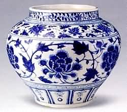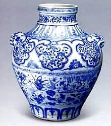 元代景德镇的湖田窑成功地烧制出青花瓷器。我国国内现存各地传世、出土的元代青花瓷有 100多件,散落在世界各地的元青花瓷有200多件。 元代中、晚期青花瓷器,大致可分为两大类一类多为小件器物,胎子轻薄,不甚精细,多为青白、乳白半透明或影青釉。青花的颜色灰暗迷蒙,纹饰稀疏但奔放洒 脱,有的可以说相当潦草,常见器物有高足杯、碗、盘、香炉、小罐、蒜头瓶、玉壶春瓶等,多为日常生活用品,这类青花瓷器当时生产数量有限,属民用瓷。另外 一类青花瓷器,以大件器物为多,其共同特点是大器者胎体厚重,小件轻薄,色白致密,透明釉白中闪青,青花颜色浓艳鲜亮,色浓处有黑褐色斑点。该类器件做工 精良,纹饰层次多,有的甚至多达10来层,画得很满,但繁而不乱,层与层之间留一周空白,器底端两层之间无空白,每层纹饰内容之间没什么关系,如经常是在缠枝菊、蕉叶、缠枝莲、缠枝牡丹之间夹杂云凤、云龙、杂宝、海水江牙等,将毫不相干的纹饰组合在一件器物上。这类瓷器国内传世品 极少,墓葬出土也不多见,绝大多数是窖藏出土。估计是由于当时发生了某些突然变故,在不便随身携带的情况下,埋于地下保存的。 青花缠枝牡丹纹兽耳罐 元 高38·4厘米 此罐直口,颈部稍高,鼓腹,圈足。通体纹样密满,然层次分明,排列井然有序。肩腹两侧堆贴兽耳,有孔,可供串环之用,器身牡丹花瓣与瓣之问以串珠相隔,花叶硕大,具有元代纹样特征。 青花缠枝花卉罐 元 高28厘米 此拍品1949年前曾藏于一加拿大银行家处,20世纪六七上年代先后在加拿大、日本展出。 青花鱼藻凸花牡丹大盘 元 直径48·2厘米 此盘菱花口板沿,兜腹圈足,口沿、内壁青花地留白凸起缠枝花开,盘心青花绘鱼藻纹。印花凸起纹饰是元代白釉、卵 白釉瓷器常见的装饰方法,移植到青花瓷器上非常少见,其珍贵程度不言而喻。如此硕大的盘子,适应阿拉伯人的生活习惯,应为元代景德镇窑专为西亚烧制的外销 瓷器。 青花萧何月下追韩信梅瓶 元 44.1X5.5厘术 此瓶线条圆润流畅,通体绘青花纹饰。肩部为杂宝纹及缠枝牡丹纹,腹部绘汉代典故"萧何月下追韩信"的人物故事及梅,竹、松、芭蕉、山石等纹样,下部有宝莲纹。虽通体装饰各种图案,但繁而不乱,层次分明,其艺术成就之高,在元青花瓷中似可夺冠。 青花荷鹭双耳罐 元 高37·9厘米 此罐上口缩颈,溜肩鼓腹,收胫浅圈足,肩腹之间饰两兽耳。其口、颈、肩、胫部绘画的卷草纹、缠枝花卉、双脚流云,仰覆莲中的火珠,大如意垂云山的折枝花以及主题纹饰荷塘鹭鸶,都是元代青花瓷器中常见的题材,纹饰自然流畅,疏密得当,极富韵味。 |