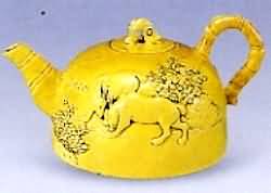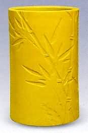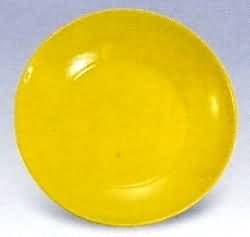 黄釉刻云龙纹碗 清康熙 口径12厘米 康熙本朝。直口圆腹,器形端正,修胎规整,施釉精细。外壁釉下浅刻双龙戏珠纹及江崖海水纹,图案精美,釉色娇艳。碗底落"大清康熙年制"六字青花官窑款,为清代黄釉中上品。 柠檬黄釉盘 清雍正 口径9.5厘米 撇口,弧壁轻薄外敞,圈足,底写"大清雍正年制"双圈六字两行青花楷书款。满施柠檬黄釉,色彩艳丽。 黄釉雕瓷壶 民 国 高16.5厘米 "汤顺与制"四字二行篆书款 黄釉仿竹竿形笔筒 清道光 高11·8厘米 直筒竹竿形,圈足无釉,余施黄釉,外壁刻竹竿嫩笋,底刻"大清道光年制"六字楷书双行款。 |