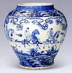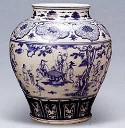 正统、景泰、天顺三朝30余年,政局动荡,使得经济生产受到很大 影响。据文献记载,此三朝有官窑产品:正统三年(1438)曾禁止民窑烧造和官窑器式样相同的青花瓷器;正统六年(1441)命景德镇烧造金龙、金凤白瓷 罐及九龙凤青花缸;正统十二年(1447)又有不准民窑私造黄、紫、红、绿、青、蓝、白地青花等瓷器的禁令;景泰五年(1451)有减饶州岁造瓷器三分之 一的记载;天顺元年 (1457)曾派中官赴景德镇督烧瓷器;天顺三年(1459)又有将原定烧造13·3万余件的瓷器准减8万的命令。从上述文献记载看,这段时期不论官、民 窑器都曾有烧造。但传世品中至今未见一件署年款的官窑瓷器,所见瓷器均为民窑所产,故学术界有"空白期"和"黑三代"之称。学术界所称原指官窑,并非民 窑。 从20世纪50年代以来,人们注意到了明代纪年墓葬的瓷料,在三朝纪年墓里出土了一批民窑青花瓷器,特别是景德镇陶瓷研究所在景德镇珠山 以西明御厂西墙外东司岭一巷道中,发现的大量明代正统官窑瓷器,品种有青花和斗彩等,呈现出与宣德、成化不同的风格。随着科学研究工作的深人,特别是对景 德镇明代官窑遗存的进一步科学发掘,空白期瓷器的真实面目将会愈加明朗。 正统、景泰、天顺朝青花瓷器就目前巳发现的资料可以肯定,就民窑生产 来说,它和其他朝代一样,并未间断过,但就决定青花生产时代风貌特点的官窑来看,三朝则仍然是一个空白期。造成官窑青花生产衰退的原因是多方面的,战乱频 繁,宫廷的争权和社会经济的衰败,固然是很重要的原因,但帝王兴趣爱好的转移,也是一个不可忽视的重要因素。景泰年1司特别风行铜胎珐琅器,所谓"景泰蓝 "即是这一时期产生的专称。 青花人物纹梅瓶 明正统 高34力厘米 估价 RMB40000一60000 此瓶小口圆唇,直颈稍长,肩圆弧略丰,腹自上至下微内收,底微外侈。造型敦厚古朴,胎骨厚重。人物图在正统、景泰、天顺三朝的器皿上甚为流行,其内容大多表现文人闲情逸趣的生活场面,三朝旦期人物的鼻子较圆,后期鼻端呈尖状,作衬托的柳树条如断续的雨点。 青花八仙祝寿图大罐 明天顺 高43厘米 估价:RMB500000-700000 直口短颈,丰肩鼓腹,腹正渐敛,宽圈足。颈部绘云纹,肩部饰如意云,肩内绘莲纹,腹部通景绘八仙祝寿、三星对弈图,笔意疏朗自然,腔部绘莲瓣纹。小伤。 青花湖石花卉纹盘 明正统 直径33·5厘米 估价:RMB30000一50000 成交价:RMB33000 盘内外壁皆以缠枝花卉纹装饰,盘心绘湖石牡丹,绘画婉转流畅,青花鲜艳典雅,白釉肥润,为明正统朝青花器的代表作。 青花人物 "三顾茅庐"罐 明景泰 高32厘米 估价:RMB50000一80000 成交价:RMB33000 胎子坚致,白釉泛青,青花淡雅,有少量黑斑,绘三顾牙庐故事图案。□伤,底锯。 青花人物图大罐 明天顺 高37·9厘米 估价:RMB120000一150000 大罐胎质厚重。罐身肩部绘海马纹,颈部绘海水纹,腹部通体绘高士秋游图,或倚栏赏景,或骑马前行,人物形象生动,笔意粗犷飘逸。青花色泽具有晕散效果。有修。 |