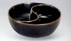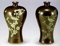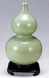 孔雀绿釉刻双龙云蝠纹胆瓶 清乾隆 高31.4厘米 小□直颈,溜肩垂腹,圈足,因形似胆而得名。胎白细坚致,釉薄透可见白胎,色浅润泽,胎上所绘云龙、蝙蝠清晰可见。此瓶造型秀巧,釉面光彩照人,别具一格。 豆青釉葫芦瓶 清嘉庆 高33厘米 直口微敛,整器呈葫芦形,又称"大吉瓶",浅挖足,釉底。器身满施豆青釉,釉面滋润肥厚,大足底,一圈露胎芦宽,其上显出细密的旋纹,釉底二书青花"大清嘉庆年制"篆书款。红木座。 茄皮紫釉暗刻赶珠龙纹盘 清康熙 直径25厘米 "大清康熙年制"六字二行楷帛款,康熙本朝。盘为圈足圆腹,小外翻唇口,形状典雅周正。盘内外壁装饰赶珠龙纹,所刻龙纹王动流畅,威严凶猛,为康熙时期典型纹饰。茄皮紫釉,明代嘉靖生间生产逐渐广泛,以清康熙时期最为精致。 黑釉格碟 清康熙 口径9·5厘米 弧壁圈足,碟内"S"形等分,似太极图;满施黑釉。底刻 "大清道光年制"六字篆体印章款 酱釉白花鸟梅瓶 (一对) 明 高12·7匣米 瓶体修长,束颈,小□外撇,丰肩,肩以下渐敛,底足略外侈;瓶内瓶底施白釉,外壁施酱釉。酱釉与白地花鸟相映成趣,生意盎然。 |