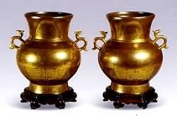 明,清仿影青釉,均是薄胎刻印暗花,以明永乐仿影青产品最佳,传世完整器见有一种刻暗花的碗,胎壁很薄,多刻缠枝纹,刻纹中渗入釉汁,使刻纹产生层次变化,此种碗未见一件刻官款的。嘉靖、万历时流行一种小碗、小杯,器口多施一圈酱黄釉,胎壁印荷莲、鸳鸯等纹饰。 窑变花釉是清雍正时期在仿钧釉的基础上新创烧的品种,釉面以红色为主,天蓝、月白、绿、褐,黑等杂色交融流淌其中,其偏红者习称"火"。常见造型除仿古 的匜,洗之外,以瓶、尊陈设用瓷居多。官窑均在底款阴刻篆书四字或六字本朝款,民窑则以砂底为主,少有酱色釉底的,且均无款识。乾隆,嘉庆,道光、咸丰时 期窑变花釉继续生产。同治以后,窑变花釉逐渐演变为红、黑二色的颜色釉,尤以大件瓶,尊居多。 官釉是清雍正时唐英仿明代官釉新发明的品种,分为鳝鱼黄、皮绿和黄斑点3种,现习称"茶叶末釉"。此外尚有蟹甲青釉一种,此种釉色呈深青绿色,类螃蟹壳色,故而得名。 铁锈花釉和仿古玉釉是清雍正时新创的釉色品种,它们都是铁结晶釉。乾隆时铁锈花釉曾盛行一时。两种釉多为官窑所产,多有篆刻阴文本朝款,乾隆以后两种釉 色均较少见。雍正时出现、乾隆时盛行的仿石,仿木,仿漆器,仿青铜器、仿金银器等的各种釉,均是低温釉,与其说是釉,不如说是彩。总的特点是制作上精要细 作,全是官窑所产,或刻款,或描金款,没有青花款。鉴定这类瓷器,一是要记住它们全是低温釉;二是仔细辨认款识特征,字体均有时代特征,或写"年制",或 写"仿古"。 茶叶末双耳葫芦瓶 清乾隆 高26厘米 “大清乾隆年制”六字三行篆书款,器形周正,两侧以细长的绶带如意柄装饰,束腰部模印菊瓣纹,潇洒飘逸,满施茶叶末釉,釉色纯正均匀. 仿青铜器古铜彩描金鹿耳尊 (一对) 清乾隆 高26.5厘米 以商周时期古铜器尊为原形,圆腹,撇口,足略外撇,肩部装饰一双鹿形描金耳;尊体表面纹饰亦以古代青铜器上的装饰风格为蓝本,古铜色釉褐中略带紫,上描金,模仿嵌金铜器;圆腹上绘米字形纹饰和蕉叶纹,颈部为蕉叶纹,足墙上为回纹,底帛"敬畏堂制"四字二行楷书款。 |