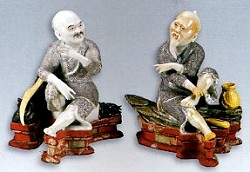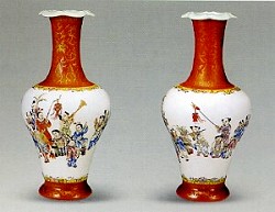 民国时期的瓷器生产,从数量和质量上看,都大不如以前了,不但没有什么发展和创新,反而日益萧条。 民 国时期,瓷器胎骨极细,民窑产品较多,如与历代瓷器相比较,差距很大。瓷釉与胎骨密,釉面上出现气泡和脱釉现象。青花瓷器颜色晕暗发蓝,俗称洋蓝。洋蓝是 光绪末期在我国出现的,这时民窑青花瓷器大部分施用洋蓝,绘画精细的渐少,草率的增多。这一时期,有大量仿古瓷器,青花瓷仿品表现青花的层次失真,显得呆 滞,有的虽青翠,艳丽,但漂浮感极强。 粉彩薄胎人物纹橄榄瓶 (一对) 民 国 高9·3厘米 "乾隆年制"蓝料款。造型似橄榄瓶,薄胎,口足边绘蓝料如意,璎珞、回纹,器腹绘教子图,器形小巧可爱,制作精致,是民国薄胎粉彩器精品。 粉彩渔樵问答人 民国 11X11厘米 "大清乾隆年制"六字三行篆刻款,小伤。 珊瑚釉捕金粉彩婴戏图瓶 (一对) 民国高33·3厘米 "大清乾隆年制"六字三行篆书款 墨地三彩穿花龙纹凤尾尊 民 国 直径7厘米 入口外撇,长颈,圆腹下收敛,足外撇,颈部和器腹均绘墨地穿花龙纹。口沿,肩部、近足处分别饰如意云纹,锦地开光折枝花纹、莲瓣纹。器形硕大,色彩素雅。 何许人墨加彩踏雪归庄纹盘 民国 口径30·2厘米 "许人出品"四字二行篆书款。 |