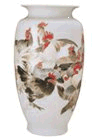 湖南醴陵所产的瓷器。有日用瓷与陈设瓷,薄胎注浆,瓷质洁白,装饰的主要特色是釉下五彩,闻名中外。另除有釉上贴花和喷花等外,1958年还试制成功一种感光晒花的新装饰法。建国以后,这个地区的瓷器在技术方面不断革新创造,生产发展很快,已成为全国重要的瓷区之一。 1915年巴拿马太平洋万国博览会醴陵釉下五彩瓷获奖精品(湖南陶瓷陈列馆馆藏作品) 为庆祝中美洲和南美洲之间,沟通太平洋和大西洋航运的巴拿马运河竣工,由美国主办、有三十多个国家参加的盛大赛 会,于1915年2月至12月在美国加利福尼亚州的旧金山举行。参赛内容包括科学文化艺术及工农业、矿产、工艺美术等等,中国也通过一年多的时间,筹集各 类展品重量达一千五百吨之多参加赛会。醴陵釉下五彩瓷在连续三次参加国内外赛会获优质金牌奖的基础上,进一步提高瓷质,提高设计工艺水平,创制了釉下五彩 瓷精品,参加了这一世界性的赛会,并获得最高优质金牌将的荣誉,使醴陵釉下五彩瓷的知名度更是名扬四海,驰誉五洲。 【竹鸡喇叭瓶】:高46cm,采用釉下五彩特有的装饰手法精心制作,瓷质优异、色彩鲜明、晶宝润泽、耐酸耐碱、永不褪色。该作品于1915年参加巴拿马太平洋万国博览会获得金牌奖。 据考该作品系醴陵瓷业学堂著名陶瓷艺人彭晓晴先生设计并制作。 邓文科,艺名毅蜂,1930年生,湖南醴陵人。系中国工艺美术学会设计家研究会常务理事,1990年被评为湖南省工艺美术大师,1993年荣获国务院颁发的“为发 展我国文化艺术事业做出了突出贡献”证书,同年被评为中国工艺美术大师,从事陶瓷美术工作50余年,在长期的艺术实践中,擅长用绘画的形式和写实的手法进 行创作,并在作品中体现了深厚的功底和不拘一格、多姿多彩的艺术特色。此外,还有20多万字的专业论著行世,主要著作有《醴陵釉下彩瓷》和与邓白教授合编 的《醴陵窑》等,分别由中国轻工业出版社、上海人民美术出版社和日本美乃美株式会社出版。邓文科在中国书画方面亦颇有造诣,尤以花鸟、篆书、隶书见长,由 于湖南省美协的推荐,他的名字早已载入《中国美术家人名大词典》。 【群鸡将军瓶】:釉下五彩《群鸡将军瓶》创作于80年代。从70年代初期开始,他就特别喜欢画鸡,尤其爱画群鸡,他曾经写过两首诗,可见他对于画鸡是何等之热爱。