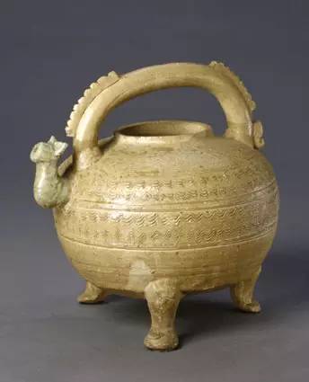 春秋战国 原始瓷提梁盉,高17.7cm,口径7cm 盉直口,圆腹,下承以三兽形足,流为兽头状,壶体另一侧饰一卷曲短尾。提梁为弓形,顶部两端饰有锯齿形棱脊,肩、腹部饰以四道连续的水波纹。器物造型古朴端庄,釉色青中泛黄,施釉均匀,纹饰简洁明快,富有动感。 原始瓷出现于商前期,盛行于春秋战国时期。战国以前,由于当时工艺技术水平低下,原料处理未经精细的过滤、淘洗、捏练、陈磨等工艺过程,器物造型简单,胎体多有裂纹,釉色很不稳定。战国时期,原始瓷的制作有了长足的进步,其烧结性能和器表施釉等方面均有很大发展,器形规整,釉层厚薄均匀,釉色青黄,造型多仿当时的青铜器,有尊、鼎、簋、盉、豆、钟等,纹饰多以刻、划、捏塑等为装饰,具有纯朴简洁的风格。 此盉造型规整,釉色均匀,是原始瓷中的佼佼者。 |