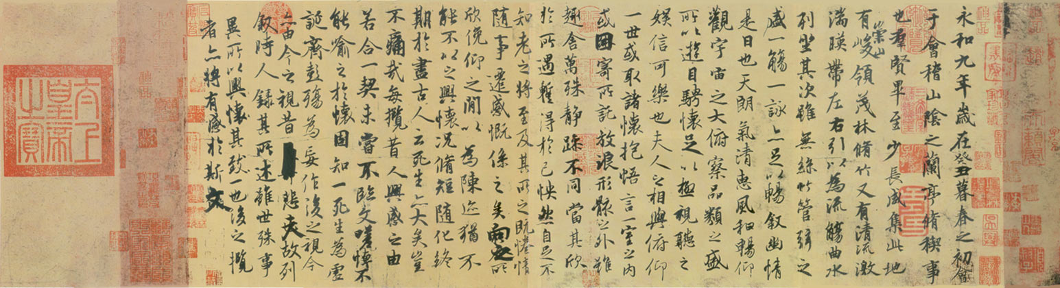 右军将之传给子孙,直至七代孙智永,遗付给辩才,后来被唐太宗「骗」入内廷,唐太宗对他的字着迷不已,曾命搨书人赵模等各搨数本赐给王、臣、真迹则陪 他殉葬在昭陵了。武后时,韫桓掘发,真迹又复出,收入玄宗内府,且刻石置于学士院,称为「定武兰序」,经历宋、金而亡。但此本和今天流传下来的墨本各不相 同,很难确定究竟原来是什么样子。 ##########NextPage##########