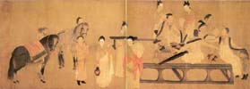 ◆陆探微(?-约485),吴(苏州)人,是南朝宋文帝和明帝时的近侍之臣。他的画被南齐的谢赫评为当代之冠。但是他的画现在一张也没有传下来,我们今天只能从文献中去了解他的本来面目。据记载,他画的人物形象属瘦削型,符合用笔“劲利,如锥刀”的效果,正是“秀古清象”的感觉。又提到他在线条的运用上,“连绵不断”,所 以又有“一笔画”的说法。后人把他和顾恺之归在一起,作为“密体”的代表画家。 ◆张僧繇,吴(苏州)人。梁天监中为武陵王侍郎,直秘阁知画事,历右军将军、吴兴太守。苦学成才,长于写真,并擅画佛像、龙、鹰,多作卷轴画和壁画。成语“画龙点睛”的故事即出自于有关他的传说。记载他在金陵一乘寺用讲求明暗、烘托的“退晕法”画“凸凹花”,有立体感,可知他已接受了外来的绘画技法。文献里说他作画,“笔才一二、像已应焉”,很象现在的速写,被称为“疏体”。今有唐人梁令瓒临摹的《五星二十八宿真形图》传世,现已流往日本,但这幅画的用笔和记载并不相同。他对后世的影响很大,唐朝画家阎立本和吴道子都远师于他。此外,他还善于雕塑,有“张家样”之称。 ◆萧绎(508-554),梁武帝萧衍第五子,由湘东王职即帝位,称梁元帝,字世诚,南兰陵(今江苏武进)人。记载里说他善画佛画、鹿鹤、景物写生,技巧全面,尤其善于画域外人的形貌。传世的《职贡图》是北宋年间的摹本,虽已残缺,但仍然可以看到六朝的风貌,技法朴拙,人物神情生动。此画对于我们了解南朝人 物画的风范具有重要的意义。 二 北方的画家 ◆曹仲达,原籍西域曹国,官至北齐朝散大夫。记载中说他善画佛画,也长于泥塑,所做佛画,到了唐代被称为“曹家样”,与“张家样”并称,其特点为“曹衣出水”,意思是说他画的人衣服窄紧,好象刚从水里出来一般。已无传世作品。 ◆杨子华,在北齐世祖时任直阁将军员外散骑常侍。记载说他“天下号为画圣,非有诏不得与外人画”,在长安等地画了很多的壁画,但到今天都已经了无踪迹。只有一卷传为宋临的《北齐校书图》(现藏于美国波士顿博 |