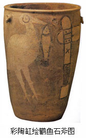 第一章 史前绘画(距今约180万年前~公元前2070年?) 在考古学上,将人类开始出现,生产工具为打制石器为标 志的时代,称作“旧石器时代”,其地质年代从二、三百万年前开始至一万年前为止,约占整个人类历史的99.8%。而新石器时代的到来,则是人类历史具有决 定性意义的发展事件。它基本上是以原始农耕、畜牧、定居、制陶、磨制石器及钻孔技术等为主要的文化特征。它是第一个在全世界的人类居住区域具有大致相同内 涵的文化,它也是各族人类在文字出现之前的最后一个文化阶段。这一进程大约在公元前9000年左右,于西亚一带所谓“肥沃的半月形地带”最早开始。在中 国,以黄河流域的裴李岗文化、磁山文化和甘肃渭河流域的大地湾文化为代表的新石器早期文化大约起始于公元前6000多年,已具有农耕、磨光石器、制陶、氏 族墓地等特征。据不完全统计,迄今为止全国已发现新石器时代遗址7000多处。目前尚未发现中国旧石器时代的绘画遗迹。新石器时代的绘画遗迹已知有岩画、彩陶画、线刻画、壁画和地画。从制作方式上,可分为两大类:一类是线刻(包括敲击磨制),如岩画及石器、骨器和陶器上的图像;另一类是涂绘,如彩陶画、岩画、壁画、地画。对于史前艺术,绘画性作品的标准实际上很大程度是依其图像的写实性程度而定。 ![]() ![]() 【岩画】 特指一种刻或画在岩石表面的图画。中国境内 共有15个省区的70多个县发现岩画遗址。目前在中国境内大体上可以确认为新石器时代的岩画有内蒙古自治区中南部的阴山岩画和江苏连云港的将军岩岩画,也 有学者认为在阴山岩画中最早期的作品应属于旧石器晚期。另外,有一些学者分别认为内蒙古乌兰察布和桌子山岩画、新疆库鲁克山兴地岩画、云南沧源崖画、福建 华安仙字坛崖画等也有可能源自新石器时代。 ![]() 阴山岩画的题材内容多为动物、狩猎、战争、舞蹈、天文图像及神灵图像等,制作技法均为敲击、磨刻,形象古拙生动。连云港将军崖崖画也是刻制,有人面、兽画、农作物、太阳、星云等图像以及一些抽象符号,风格简率、生动,其内容可能与祈求丰收和祭天的宗教观念有关。 ![]() ![]() 史前岩画的功能可能会是多方面的,如传授某些知识、表 达原始宗教的意识和情感、表达某种习俗及祈愿、表达喜庆和宣泄娱乐情绪等等。在绘画的表现手法和审美特征上,有些岩画与环境有密切联系,大部分岩画的形象 都以夸大主体形象、抓住强烈的动态特征和概括的平面敲凿或简炼的刻划线条的技术为风格特征。 ![]() 【彩陶画】 河南临汝阎村仰韶文化遗址出土的一件彩陶缸上绘有一只白鹳衔鱼,面向一柄装饰考究的石斧而立。此画被称为“鹳鱼石斧图”,其图像组合明显具有一种主题意 念,有研究者认为它记录了以鹳为图腾的氏族战胜、兼并了以鱼为图腾的氏族的历史性事件。画面为37.44厘米,构图均衡、饱满,形象简洁醒目,为史前独立 性绘画中的珍品。 青海大通县上孙家寨马家窑文化遗址出土有一件舞蹈人物彩陶盆,其内沿画着一圈3组、每组5个人手挽手跳舞的情 景,5个相同的人物形象和朝向的统一,表现了舞蹈的整齐节奏,透露出欢快热烈的气氛。有学者认为这是表现了氏族成员分组围猎野兽的场景,也有人认为是载歌 载舞庆祝丰收或祭祀神灵。在技法上,这件作品紧紧抓住人物的动态和整齐的队形,以极其精练的笔墨进行描绘,每组人物之间和人物脚下的各种线条变化自然,富 有抒情的意念。 ![]() ![]() 在仰韶文化半坡类型的彩陶盆上,还有描绘人面与鱼相连 或与鱼网相伴的图像,这类人面皆呈圆形,头上似戴着尖顶高帽,眼鼻形象明确,双眼眯成一线,耳旁或嘴旁有双鱼。学术界一般认为这类带有神秘色彩的人面纹定 与某种原始信仰有关,但具体解释不同,有崇拜鱼图腾、祈求捕鱼丰收、祈求生殖繁盛等多种说法。 ![]() 彩陶上还有鱼纹、鸟纹、蛙纹、犬纹等图像,往往都是抽 象与写实相结合,具有浓厚的绘画意趣。如半坡彩陶中有一件陶盆外壁绘有3条首尾相接的大鱼,那种张嘴露齿、体态优悠的情状,以及笔墨上的简练、流畅、老 练,在审美上给人以不小的震撼。又如甘肃省甘谷县西坪马家窑文化遗址出土的一件彩陶瓶上,绘有一条人面状的鲵鱼(俗称娃娃鱼),构图独特,表情强烈,而用笔生动,笔触豪放,明显表现出笔墨的意趣。 ![]() ![]()