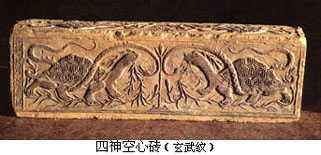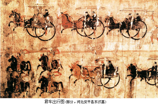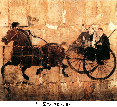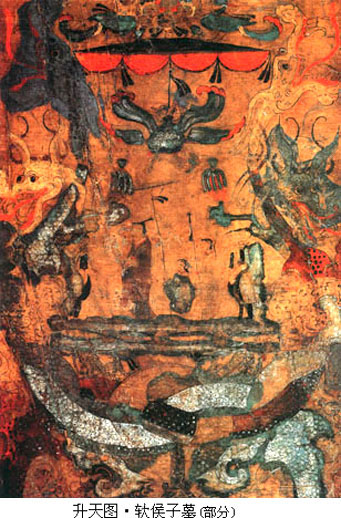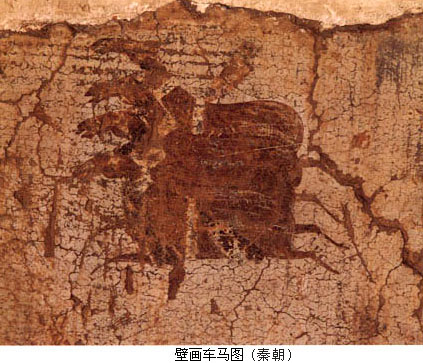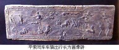 成都画像砖是用粘土模印烧制而成的实心砖,印模上凹入 的形体和阴线刻,印在砖面上便成了凸起的浅浮雕和阳线结合的效果。内容丰富多采,形象生动活泼。如出行仪仗中的“四骑士”,奔驰中的马匹神态各异,或大步 流星,或低头拱颈,或回首顾盼,或昂首嘶鸣,使得画面容易出现简单雷同的四马形象,富于变化而耐人寻味。 成都画像中描绘劳动生活的 场面极具浓郁的乡土气息。如成都扬子山出土的《弋射收获》画像砖,分上下两部分,上图是弋射,图中以游动的群鱼象征郊野的池塘,几朵将欲凋零的荷花和熟透 饱满的莲蓬竖立于水面,远处两株落叶的枯树暗喻出秋天的景色,并与下图的收获情景相关联。池中水鸟的张惶飞逃与岸上猎人的引弓待发,巧妙地表现了整个环境 由静变动的瞬间变化,传达出郊外射猎那种张弛变化、惊险迭出而又轻松活泼、饶有兴味的生活节奏。下图是收获,画中人物正在收割稻谷,右边二人挥镰而割,中 间三人弯腰收拾捆紥稻穗,左边一人手提饭篮送饭到田间,构成一幅丰收季节的田间小景,具有朴实浓厚的生活气息。画面人物动态既有对比又有变化,形成鲜明的 节奏,人物互相顾盼呼应,场面自然生动,构图上已注意到纵深关系和空间处理,显示出汉代绘画艺术的进展。 【壁画】 秦汉时代,自皇 帝宫室、贵族邸第、官僚府舍到地主住宅,几无不饰有壁画,文献于此多有记载,如《汉书·郊祀志》云:武帝“作甘泉宫,中为台室,画天地泰一诸鬼神,而置祭 具以致天神。”又《汉书·苏武传》云:宣帝“甘露三年,单于始入朝。上思股肱之美,乃图画其人于麒麟阁、法其形貌,署其官爵姓名。”汉代宫室壁画内容以明 王圣贤、忠臣义士、孝子烈女和神仙鬼怪为主,除装饰意义外,还负有表彰伦理道德之责。如《后汉书·朱佑传》云:“永平中,显宗追感前世功臣,乃图画二十八 将于南宫云台,其外又有王常、李通、窦融、卓茂,合三十人。” 秦汉宫室壁画实物仅有零星发现。秦咸阳宫殿3号遗址曾出一件残壁,是目前所发现的宫室壁画年代最早的实例。壁画内容有车马仪仗、房舍建筑等。造型简单古朴,基本上采用正侧面的剪影式构图,技法粗放,反映了早期壁画的稚拙特点。 ![]() 秦汉时人于墓室也多饰壁画。秦代墓室壁画已不可见。西汉壁画的实例可以西汉晚期的洛阳卜千秋墓为代表。该墓壁画绘于墓室脊顶二十块砖上,从后(西)至前(东)依次绘有蛇头鱼身怪物、日、伏羲、乘凤乘蛇人物、九尾狐、蟾蜍、玉兔、人物、白虎、朱雀、怪兽、青龙、持节羽人、月、女娲、瑞云;又于门额和后壁上部绘趋邪的方相氏和其它仙禽怪兽。全墓壁画以阴阳五行为架构,描绘了引魂升天、吉祥永生和镇墓辟邪三个内容。 ![]() 同样表现升仙驱邪题材的西汉晚期壁画墓在洛阳也多有发现。如1957年发现的一座西汉晚期墓,于墓门绘额上绘神虎噬女魃图,前室脊顶位置绘日月星象,主室的后室后壁绘有宴饮场景,其内容可能也与驱邪有关。画面用墨线勾勒人物轮廓,再以颜色点染,画风极为古拙粗犷。 东汉墓室壁画的题材发生变化,西汉壁画流行的灵魂升仙的画面较为少见,代之以表现死者生前身份和威仪的画面。表明东汉时人对尘世逸乐的依恋压倒了过去死 后升仙的向往。东汉早期著名的壁画墓,有河北望都浮阳侯墓和山西平陆东汉墓,前者依墓主生前官署式样布置墓室,绘有墓主的属吏和侍从,人物形象生动,姿态 自然;后者则绘有坞壁、牛耕、耧耦等画面。 东汉后期壁画墓可以于内蒙古和林格尔发现的一座砖室壁画墓为代表。壁画面积达100平方米,内容十分丰富,主要以车马出行图的形式描绘了墓主生前的全部仕宦经历。其后室南壁绘庄园图,生动而形象地描绘了当时庄园的各种情形。 ![]() 车马出行是汉墓壁画中常见的题材,以渲染死者生前的显赫威风为主要特色。和林格尔汉墓壁画以声势浩大的车马行列,组成庞大宏伟的场景,画中的人物车马造型准确生动,特别是对骏马的刻划,更是矫健昂扬,奔放有力。 壁画中的另一画面“乐舞百戏”,则是一个热烈、惊险而又扣人心弦的杂技演出场面:舞刀、弄丸、顶竿、倒立、舞轮……紧张有趣,精彩之极。画面色彩明快强 烈,构图活泼自然。虽在黑暗潮湿的墓室作画,难于谨细精描而难免显得粗率,但是人物的姿态动作却表现得活灵活现,十分传神,画工以简洁流畅随意的笔墨非常 熟练地描绘出优美活泼的人物形象,使整个画面充满了力量、运动的气势,显示出一种古拙、豪放的艺术风格。 东汉时期较有代表性的墓室 壁画还有河北辽宁营城子壁画墓,壁画绘有死者升仙等情节,而门的两侧绘有持兵器的武士形象,威猛有神,此画以线条粗率而泼辣为特点;河北安平和辽阳北园 墓、河南偃师汉墓的壁画以车马出行的场面较有气势;河南洛阳邙山发现的壁画墓,绘有神话形象、冠帻门吏等,色彩明快,线条流利;河南密县的汉墓壁画,绘有 车马出行、百戏、庖厨以及地主收租等生活场景,色彩富丽、线条苍劲有力,是较为工细之作。 ![]() ![]() 汉代壁画,在形象刻画上,已能表现出人物的性格;对人 物衣纹的处理,已运用烘染的方法,表现出衣物的质感;对人物车马的动态描绘极富于空间感和运动感,线条简练遒劲,造型夸张古拙,画面生意盎然。西汉末年的 壁画构图,尚多为平列物像,到东汉时已善于处理众多人物和比较复杂的场面。