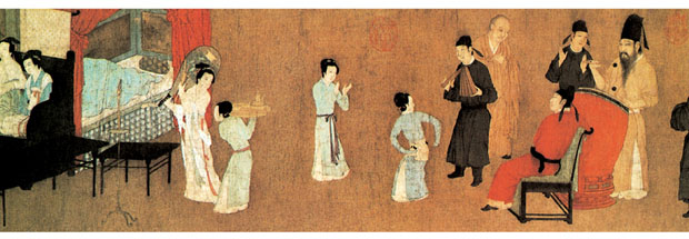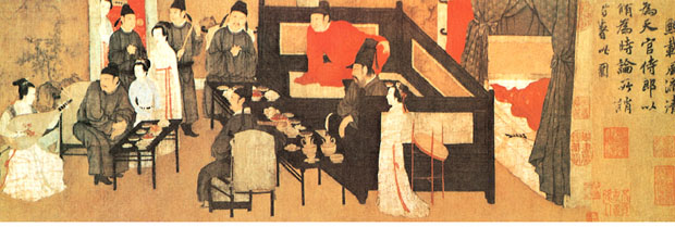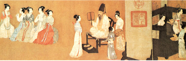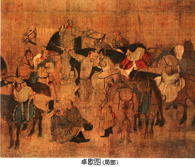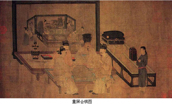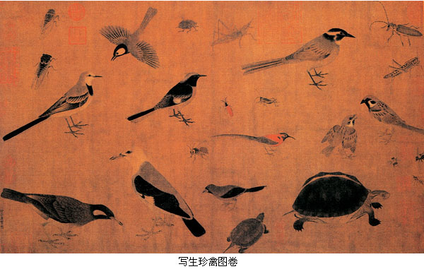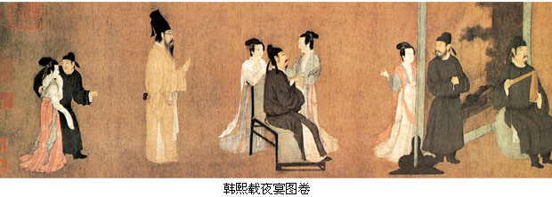 上述诸人的道释人物肖像鞍马等作品,惜大多不存;有作品传世的,以胡瑰、周文矩、顾闳中三人最足称道。 胡瑰,后唐时契丹人,或谓范阳(今河北涿州)人。擅画番马,能曲尽塞外之趣。现存作品有《卓歇图卷》,画契丹族于草原上搭立帐幕休息的情景。其中席地盘坐,举杯而饮的首领形象,动作神态颇得神韵。 周文矩,生卒年不详,建康(今南京)人。为南唐画院待诏。善画人物,仕女学周昉,衣纹作“战”(即颤动之意)笔,以此为别。传世作品有《重屏会棋图卷》,画南唐中主奕棋之状,人物身后是一屏风,屏风画中复有一屏风,故称“重屏”。另有《宫中图卷》(宋摹本)画宫女八十余人,反映宫女生活的各个方面,形像生动,饶有思致。 ![]() 另有一件《琉璃堂人物画图卷》,原题“韩文苑图”,但画风不类唐画,与一件流失海外的摹自周文矩的同名作品构图极相似,且笔法行笔劲瘦有力,与画史记周文矩“衣纹作战笔,行笔瘦硬成挚”完全符合,所以应属周文矩作品。 顾闳中,生卒年不详,为南唐画院待诏。《韩熙载夜宴图卷》是他传世唯一作品,画南唐大臣韩熙载夜间在家中饮宴听声乐观舞伎的场面。据载李后主欲以韩熙载为相,然韩熙载不欲为亡国之相,故纵情声色以自诲,李后主为警诫韩熙载,乃令顾闳中夜至韩宅,目识心记而画此图。 画分五段,“听乐”、“观舞”、“歇息”、“清吹”、“散宴”,用屏风床榻分隔,构图巧妙,人物刻划细腻传神,于主人公韩熙载超脱不羁而又郁郁寡欢的复 杂内心,尤为体察入微。如“观舞”一段,画韩熙载亲自击鼓配乐,名伎王屋山跳“六么”舞,可见出作者刻划人物复杂内心世界的深厚功力,主人公纵情声色但又 无法解脱内心烦恼的精神状态跃然纸上。 ![]() ![]() ![]() ![]() 【花鸟画】 五代花鸟画家名家辈出,代表画家有黄荃、徐熙。 黄荃,生卒年不详。为西蜀画院画家。他曾于蜀宫壁上画四时花竹兔雉鸟雀,鹰“误认殿上画雉为真,掣臂数四,蜀主叹异久之”(黄休复《益州名画录》)。蜀主以至于命翰林学士欧阳炯作《壁画奇异记》记此事。黄筌多写蜀宫御苑中的奇花异鸟。极为工整细致、富丽堂皇。其子黄居寀承父业,亦善花鸟。北宋年间的画院画家多以黄氏父子艳丽、细巧、富贵的画风为尚。 黄荃的传世真迹《珍禽图》,为付子黄居宝临摹的课徒稿本,设色画虫鸟和大小龟二只,线描极细,有的地方为晕染的色墨笼罩,与画史所称“诸黄画花妙在傅色,用笔极新细,殆不见墨迹,但以轻色染成”可相映证。 ![]() 徐熙,生卒年不详。钟陵人。为南唐逸士。多画江湖汀花野竹,水鸟渊鱼。画史称其“落墨为格,杂彩副之,(墨)迹与色不相隐映也。”(郭若虚《图画见闻志》)又称其“以墨笔画之,殊草草,略施丹粉而已,神气迥出,别有生动之意”。(沈括《梦溪笔谈》)大抵徐熙作画,以墨线为主,傅色为辅,大别于黄筌的设色浓重的没骨画法。传世作品有《雪竹图》、《雏鸽药苗图》,未必可靠。 中国花鸟画自五代以降,无不首推徐、黄二派,所谓“黄家富贵,徐熙野逸”。徐熙之画入宋后受黄派排斥,不为时重,其孙崇嗣因祖父传派不行于时,“又出新意,不用描写。止以丹粉点染而成,号‘没骨图’,以其无笔墨骨气而名之,始于崇嗣也”(汤垕《图绘宝鉴》)。“没骨法”虽始作于黄荃,而继其后专以“没骨图“著名者,则反为徐熙之孙徐崇嗣。明清人不加深究,遂讹传“没骨花”的创造者是徐熙。 |