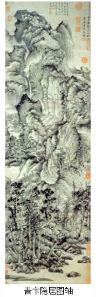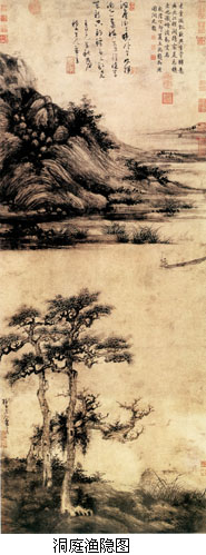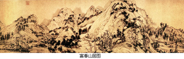 高克恭擅长山水,融合米氏云山兼取董巨披麻皴而自成一家,时有“南赵(孟頫)北高”之称。其传世作品《云横秀岭》,云烟蒸腾,山麓坡谷,丛林茂密,清溪涓流,笔墨凝重浑厚,意境清旷幽远。此外尚有《春山欲雨》、《竹石》等传世作品。 黄公望(1269~1354年),字子久,号一峰、大痴道人等,江苏常熟人。他曾为小吏,因事入狱,获释后入全真教,往来杭州、松江等地以卖卜为生。他是元季四家中唯一得与赵孟頫交游的人,自称“松雪斋中小学生”。 黄公望山水师法董巨,能变其法,自成一家。他擅长写生,每逢出游,必携纸笔,心追手摹。其晚年作品《富春山居图卷》长达两丈,状写富春江两岸初秋景色,前后历经三四年的惨淡经营,始告完成。画中峰峦平坡,丛林密树,起伏变化无穷;水村山庄,渔舟芦荻,层出不尽,涉笔成趣,全图笔墨苍茫,意境高逸,为黄氏 平生最为得意之作,素有“画中兰亭”之称。 《富春山居图卷》中山石树木的表现特色是,简化了传世董源作品中披麻皴笔法组织的规则性,真正实现 了“用笔甚草草”,更为真实地表现出江南丘陵土山戴石的形体特点。同是描绘江南山水,黄公望的观察较之董源更为细致复杂,更少概念性,因而在表现上更为凝 练、丰富,更符合人的视觉感受。此图反映了元代画家对视觉的客观感受的高度重视。画中虚景与实景之间由于微妙的墨色渲染而贯通一气,天地之间虽然悠远寥 廓,却是一个有机的整体。画中空白之处也真正成为具有实感的空间,这种代表“气”的空白不再是作为山水的装饰,也不是作为什么象征而存在,而是让它按自然 中的原有状态浸染万物,令人产生一种亲和感。《富春山居图卷》历经辗转流传,至明末为吴洪裕所得。吴氏宝爱异常,坐卧不离,达数十年之久。吴临终弥留之 际,竟以画投火相殉,幸得其侄抢救及时,大体完好。此后画分为二,灼焦的一卷,称“剩山图”,余下完好一卷,称“无用师卷”。 ![]() 黄公望的山水画又有浅绛山水一体,在画上笼罩淡赭色,增加画面的整体感,也使墨色更加滋润,有《九峰雪霁图》、《快雪时晴图》等传世作品。黄公望在后世被誉为“元四家之冠”,在清代甚至形成“家家一峰,人人大痴”的局面。 吴镇(1280~1354年),字仲圭,号梅花道人,浙江嘉兴人。以卖卜为生,一生穷困潦倒,其人生前不名于世,连画也被讥为“有酸馅味”,直到明代,方渐为人们所重视。 ![]() ![]() 吴镇山水师法董巨而自成一格。诗书画皆擅,尤长于山水 梅竹。传世作品《洞庭渔隐图》笔法苍郁,水墨淋漓,自题“洞庭湖上晚风生,风揽湖心一叶横,兰棹稳,草花新,只钓鲈鱼不钓名。”表达了画家谢绝世事、寄兴 山水的高情逸志。《渔父图》笔法凝练坚实,水墨圆浑苍润。《芦花寒雁图》写江南芦花浅水之境,但见一叶孤舟,摇漾于烟波之上;舟中一人,仰望数行寒雁飞 过;意境极为辽阔,思致深远而略带哀愁。 王蒙(1298?~1385年),字叔明,湖州人,号黄鹤山樵,又号香光居士,赵孟頫外孙。明初任泰安知府,因胡惟庸案被牵连,死于狱中。 王蒙多以纸作画,皴擦多重,追求蓬松苍茫的效果。所画丘壑多至数十重,树木不下数十种,径路迂回,烟蔼微茫,曲尽山林幽致。《青卞隐居图》、《夏山山居 图》、《葛稚川移居图》等传世作品充分显示了他在绘画上的卓越成就。《青卞隐居图》是他水墨山水画中的杰作,画山石用牛毛皴,墨色的运用尤见工力,干湿浓 淡焦无所不用其极,笔墨繁而不乱,构图满而不塞;山头点笞亦技法多样,有浑点、破竹点、胡椒点、破墨点,充分表现出山上树木的茂密华滋;远景以紧密的皴擦 写之,表现出空间的深度。 《青卞隐居图》笔法虽从董源笔法中化出,而更轻灵多变,摇曳生姿,别有一种清美的境界和幽约的景象,以之描绘暮蔼飘萧、烟丝醉软的江南山水,实为出色当行。 倪瓒(1301~1374年),字元镇,号云林,江苏无锡人。其家为江南富户,藏画颇丰,性情狷介,好洁成癖。元末暴民起事,他散尽家财,浪迹太湖,“扁舟箬笠,往来湖泖间”达二十余年。 倪瓒山水初学董巨,晚年一变古法,用侧锋折带皴画山石,笔墨简淡秀峭,作品多表现太湖辽阔旷远的自然风光,意境峭洁清远。章法布局别具一格,多采用平远 构图,近景一处平坡,数株疏树;中景留白,寓意辽阔的江面,远景一带淡山,构成“一河两岸”的两段式章法。又于画面中右方用小楷长题以连接上下两部分的景 色,使全图浑然一气。自称“仆之所谓画者,不过逸笔草草;不求形似,聊以自娱耳。”传世作品《容膝斋图》画垒石疏林,平坡小亭,江山平远,寂然无人,给人 以萧瑟疏落之感。此外尚有《幽涧寒松图》、《渔庄秋霁图》等作品传世。 倪瓒的作品,清莹剔透,集中提炼了文人绘画中高逸与优雅的精 神,在其清幽、洁净、静谧和恬淡的意境中,透露出一种似很微漠但又是不可掩抑的深长的感伤情绪,它所抽绎出来的坚贞高洁,缠绵哀怨之思,正是元代文人于黑 暗环境中郁闷凄苦心情的自然流露。读倪瓒的作品,仿佛置身于一种清超幽迥的境界,而有凄迷怅惘难以为怀之感。宋人山水,意味难有此等灵隽,此则倪画的妙处 所在。大抵倪画取材于太湖风光,造成一种人化之境,借以表达情思,言近旨远,使观者骤遇之如在耳目之前,细品之而得隽永之趣。也正因此,倪瓒的作品历来被 视为中国文人画和最高逸品的典范。 倪瓒的主要成就,在于他以真纯的感受直探人生核心而形
