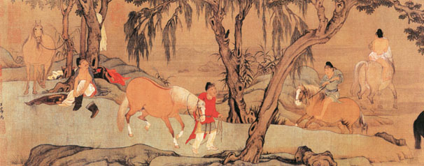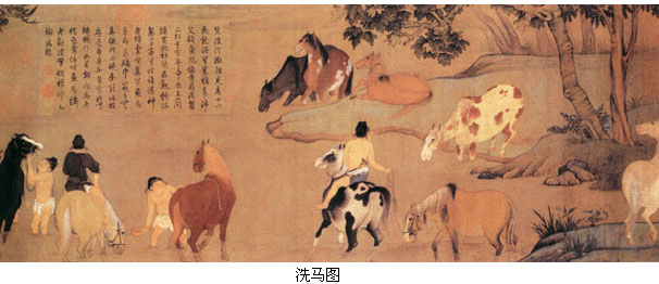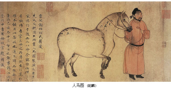第八章 元代绘画 蒙古人原本为漠北一游牧民族。1206年成吉思汗统一蒙古各部,建立蒙古政权,其后灭夏亡金,占有中国北方。1271年忽必烈正式定国号为元,继续对南用兵,1276年攻陷南宋首都临安,并于1279年厓山一役彻底击败南宋残余部队。中国第一次全境沦陷异族之手。 蒙元以异族入主中国,把辖内各民族分为四个等级,依次为国人、色目人、汉人、南人,并对“汉人”、“南人”颇为岐视。汉人即原金朝辖区的汉人、女真人、契丹人,他们主要继承的是辽、北宋、金以来的中国北方文化。南人即原南宋辖区的汉人,在四种人中地位最低,广大的汉族知识分子仕进无门,便寄情于文学艺 术,文人画遂得以长足进展。 元代对外文化交流空前繁荣,在对外征服战争中,蒙古贵族接触到许多宗教,如佛教、道教、基督教、伊斯兰教、摩尼教等,蒙古统治者对各种宗教均采取包容的态度。此外,元代西域文人的华化艺术也丰富了中国的文化宝库。 元代不设画院,除少数专业宫廷画家和部分身居高位的士大夫画家外,其余多为隐居不仕的文人画家。文人画强调绘画的文学性和笔墨情趣,重视绘画中诗、书、画的结合。提倡“古意”和“士气”,主张师法唐、五代和北宋,反对南宋院体画风。在理论上延续了北宋苏轼、米芾等文人画的传统并有所发展,强调主观意兴的 抒发。在题材上以山水、花鸟为主,人物画相对减少。元祚虽然不长,但其间名家辈出,是中国绘画史上一个重要的时期。 【山水画】 从 宋入元,起了一次重要的变革,产生这次变革的原因很多,较为直接的主要有两个方面:一是自北宋苏轼以来文人画自身发展的趋势所致。二是工具材料的变化,绡 素逐步为纸张所代替,用纸作画可用干笔皴擦,以干代湿,似枯而润,更有苍茫烟润之气;而纸吸水性强,对笔墨技巧要求较高,从而促使元人改变宋人皴擦点染的 固定程式,拓宽了笔墨的表现力。 赵孟頫、钱选、高克恭等人是这次变革的先驱,而完成这次变革的则是被后世称作“元季四大家”的黄公 望、吴镇、倪瓒、王蒙等人。元四家在赵孟頫的影响下,广泛吸收了唐、五代、北宋水墨山水画的长处,充分发展了笔墨在绘画中的作用;同时突出了绘画的文学趣 味,使诗、书、画融为一体,开创了一代新风,形成了以“文人画”为主流的山水画派。 中国山水画发展至宋代,在题材、风格、技法、意 趣等诸方面,皆可说是应有尽有,成熟得无以复加,臻于登峰造极之境了;但元代文人画家却能在另一方面施展他们的艺术才能,于宋画格局之外另辟蹊径,从而形 成了中国绘画史上宋画之后的第二个高峰。说文人画占据元代画坛主流只是就这个意义讲的。若论画家人数和作品在当时的普及程度,职业画家及其作品应比文人画 家为多。 五代时的董源、巨然在沉寂三百多年后被元人重新发现,元人的这一师承取向标志着山水画审美趣味的一个重要转折,即从五代直至南宋的雄伟粗犷风格向平淡天真画风的转变。 赵孟頫(1254~1322年),字子昂,号松雪道人,吴兴(今浙江湖州)人,为宋朝宗室。元初被荐入京授官,历经五朝,官至翰林学士授旨。虽得统治者赏识,但毕竟只是文学侍从之臣,无法施展政治抱负,又因以宋宗室入仕新朝,为时人所不满,不免有故国之思和内疚之情。 赵孟頫修养较为广博,诗书画均有很高成就。在艺术理论上提倡画“贵有古意,若无古意,虽工无益”,并把“古意”与士大夫画“不求形似”的主张结合起来,为元代文人画的勃兴奠定了理论基础。在技法上,他强调以书法的笔墨情趣作画和在纸上以水墨作画。在绘画上博采唐宋绘画之长,融会贯通,自成一格。兼擅人 物、鞍马、山水、花鸟、竹石,工笔、写意、设色、水墨诸体兼备。 ![]() 赵孟頫的山水画风格多样,既有师学唐人青绿一体,又有 学五代董源、巨然和学北宋李成、郭熙的水墨一体。学唐人的作品多作重彩设色,如《幼舆丘壑图》,取材东晋谢醌放达不拘,寄迹丘壑的故事,山石树木皆空勾无 皴,青绿填色,极为古朴雅拙。学董巨有设色、水墨二体。设色以《鹊华秋色图》为代表,此画写济南郊外鹊山和华不注山景色,山石用披麻皴杂以荷叶皴勾皴,再 以青绿皴染;山居小村,秋林红树,洲渚渔舟,芦荻疏叶,则精描细写,又以青、赭、红、绿等色调加以渲染,笔法潇洒秀逸,设色清淡明雅。水墨以《水村图》为 代表,此画构图与《鹊华秋色图》相似,但更多地采用了中景和远景,意境更觉清旷潇疏;山石用披麻皴法,多干笔皴点,表现出文人画中独特的笔墨趣味,对后世 影响极大。学李郭则如《重江叠嶂图》和《双松平远图》,多用湿笔勾皴点染,画面墨气淋漓,意境清雅。 ![]() 赵孟頫在人物鞍马画上的成就也很突出,有《秋郊饮马图》、《人骑图》、《红衣罗汉图》、《洗马图》等作品传世。此外,在古木竹石亦有相当成就,有《窠木竹石图》、《秀石疏林图》等传世作品。 ![]() 赵孟頫一方面继承前人传统,一方面体察自然,参以己法,创造出具有时代风格和个人面貌的作品,为元代初期画坛的领袖人物。其妻管道升,儿子赵雍、赵麟也擅长绘画。 ![]() 钱选(1239~1301年),字舜举,号玉潭,吴兴(今浙江湖州)人。与赵孟頫同为吴兴八俊之一,入元不仕,隐居终生,为南宋遗老画家之一。人物、花鸟、山水皆能,多以古代高人隐士、家乡山水为题材。 ![]() ![]() 钱选山水师学北宋赵伯驹,又能自出