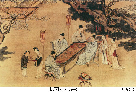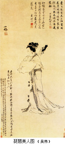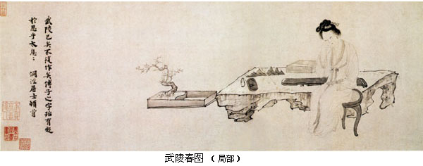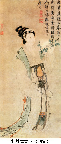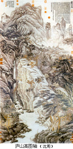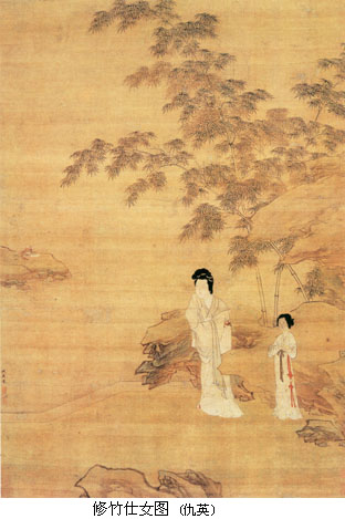 沈周、文徵明、唐寅、仇英四人是此期活动于苏州的重要画家。后世遂合称他们为“吴门四家”。 沈周(1427~1509年),字启南,号白石翁,人称石田先生。长洲(今苏州)人。工诗文,书学黄庭坚,山水、花鸟、人物无一不能。中年画法细谨,晚岁粗简,融合宋元诸家,自成一格。中年作品可以《庐山高图轴》为代表,仿王蒙笔法,山峦 层叠,树木繁茂。晚年作品可以《沧洲趣图卷》为代表,画秋冬之际山水,用笔苍健沉雄,厚重老辣。其花鸟画学释法常一派的简笔水墨画法,变宋人工丽为雅逸,笔墨苍润,构图精简。如《枯树八哥图》,枯树枝头,立一八哥,全以粗笔泼墨出之,生趣盎然。 ![]() ![]() 文徵明(1470~1559年),初名璧,后以字行,又改字徵仲,号衡山居士。长洲(今苏州)人。曾官翰林待诏。工诗文、书画。山水学赵孟頫、吴镇、王蒙而自成一家。亦善人物花鸟。也有“粗文”、“细文”之称,而以细者居多。粗者近沈周作风,细者则是画面采用层叠而上的布局,用笔细谨,风格秀润清苍,虽乏淋漓之气和纵深感,但较沈周更具抒情意味。 文徵明的山水画可以《石湖清胜图卷》为代表,写苏州石湖景色,笔墨精简,秀润可人,一派恬淡的文人理想化意境。人物画则有《湘君湘夫人图轴》存世,仿顾恺之笔意,衣纹作游丝描,造型精致古雅,人物顾盼生情。花鸟则仿沈周而透逸过之,代表作如《花卉册》。 ![]() ![]() 唐寅(1470~1523年),字子畏,又字伯虎,自号六如居士,吴县(今苏州)人。唐寅早年,不仅风华文采,倾动一时,而且少有大志,弘治年间中应天府(今南京)解元。但因恃才傲物,遭友人讥恨,遂有科场案,被革去功名,此后落魄一生。悲剧的遭遇和忧郁感伤的心情,使他的艺术创作,虽绰约多姿但又略带病态。 ![]() 唐寅于山水、人物、花鸟无一不工,虽师从周臣,学李唐 等院体,但有“文人画”风格。山水学李唐、马远,石法带水长皴,于俊秀中寓雄健风格。《落霞孤鹜图轴》,写水榭临江,一人坐眺落霞孤鹜之境,画题取初唐王 勃少年得志之意,为自己坎坷不遇吐露不平之气。其人物画则有意笔和工笔二种。意笔可以《秋风纨扇图轴》为例,画一女子临风执扇,神态憔悴,若有所思。借秋 来扇收比喻妇女任人拾弃是中国古典文学上的常见题材之一。汉代班婕妤《怨诗》:“新裂齐纨素,鲜洁如霜雪。裁为合欢扇,团团似明月。出入君怀袖,动摇微风 发。常恐秋风至,凉风夺炎热。弃捐箧笥中,恩情中道绝。”唐寅此图题画诗:“秋来纨扇合收藏,何事佳人重感伤。请把世情详细看,大都谁不逐炎凉。”此图诗 情画意,寓意殊深,反映出作者郁郁不得志但又无可奈何的感慨之情。工笔可以《蜀王宫姬图》为例,画中宫女鲜衣靓装,银钗簪花,于极力描绘人物雍容华贵中微 寓作者玩赏之意,既可见唐寅艺术才华的全面,也见其颓废放浪的才子本色。唐寅的花鸟画则用笔不多,简练传神,在沈周、林良的写意法之间,较为潇洒秀逸。代 表作如《春雨鸣禽图》等。