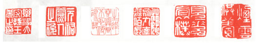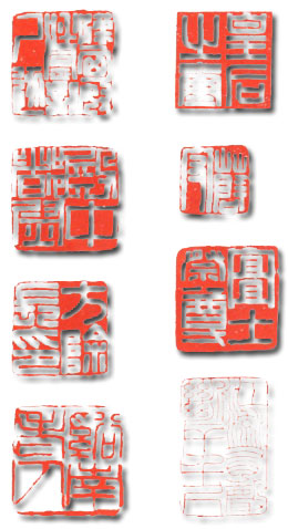 “虚”与“实”是章法分类的总纲,纲举才能目张。有了这个准则,在印章设计时可注意并掌握上虚下实或上实下虚、左虚右实或左实右虚、周虚中实或 周实中虚等等。邓散木在《篆刻学》中有章法分类14种,后又有人将章法分成25种,其中有轻重、增减、屈伸、挪让、盘错、离合、粗细、直曲、长短、欹正、穿插等。但在“虚实”这个准则下,14种乃至25种方法都是谋求虚实效果的一种手段。这里所谈章法分布50例,每一种方法都不是孤立的、单一的,在一方印 章的构思布白中,它可以用多种布局方法综合而成。 1.满实法(满实法印例参见附图中“安北将军章”、“宜春禁丞”、“琅雅柏印章”、“梁清标印”四印) 满实法亦叫匀称法。入印文字分布匀称,印面较满、较实。布白浑厚平正,字画之间距离较繁密,印之四角充实,黑白虚实虽有变化但没有大起大落。对 笔画少的印文,则通过穿插、加叠或面积对比法,使少画字满而不虚。大多数字画是横平竖直,曲在直中求,圆在方中见。无论用冲刀、切刀,均以粗壮为宜。用满 实布局刻就的印章,其特点庄重、朴实、大度,且稳如泰山,给人以端重浑穆的印象与美感。这类印作是汉印中的典范,富有传统性,初学篆刻可从这里临摹起步。 为了使印章“满”而且“实”,必要时可采取一些附加手段。如白文印四周加一道白边,将印文作隔边、顶边处理,或在印中加“田”字格、“井”字格、“十”字格,使印章更加丰满充实。 满实法印章另有几点须加说明:(1)印文字画粗壮一致的前提下,要注意变化。字体结构简而少的字,笔画可粗一些,繁而多的字可稍细一些。这种变 化以不影响谐调为宜。(2)印文平正端庄之中要有斜曲灵动的变化。满实法印章要避免平板,过于规矩,可用一些短斜、带曲的线条,以增加动感。(3)入印文 字匀称、整齐之中,可辅以大小不同的变化。满实法印章大多是匀称等分的,但不能墨守成规,不知其变。入印文字面积对比法最适合文字繁简、疏密悬殊的印章设 计。 2.满虚法(印例参见附图中“长金之玺”、“皮聚”、“蔡湫”、“心伯氏”四印) 满虚法印章是指印面以稀、疏、虚为主,视觉效果空灵、简明、疏朗。入印文字一般笔画较少,线条细薄,布白空虚,字画之间距离相对较远、较大。对 白文印而言,留红较多;对朱文印而言,留白较多。这类印章线条一般都以横平竖直的直线为主,圆线、曲线为辅。用刀可冲可切,以轻、以浅为主,突出端庄、清 秀、瘦劲的格调,多留一些遐想、回味的余地。这类印作先秦、战国、已很多见,历代印人都有拓展。由于它的简明扼要,线条变化含蓄,印面上没有过多的繁琐与 过多的屈曲,因而最受初学者青睐。 满虚法刻就的印章,其边栏一般较粗壮厚实,主要是为了突出印面的“虚”,与印面形成虚实反差与对比。如果说满实印章是红霞满天或是白云万朵,一 派环宇充实、天满意足,令人叹为观止的话,那么满虚印章则是万里蓝天、絮云几丝、天高气朗,一派海阔天空、清明净洁、令人心旷神怡、充满幻想的意境。 3.上实下虚法 印章在虚实布白上,重心向上移,印文分布在印章的偏上方,形成上部紧密、满实,下部稀疏、空虚的效果,如附图中“钱 超白事”、“曹氏印信”、“书堂”、“种竹道人”四印。上实下虚式的印章能给人以舒适、庄严、飘逸之感。在设计这类印章,主要有如下几种方法。第一,可以 上部有印文,下部无印文,或是上部印文字画的伸展、延续与下垂。第二,印章上部字画粗壮,而下部字画较细小。第三,印章上部字画紧密,可采用增繁、增曲叠 等方法,使上部繁密满实;印章下部字画稀少,可采用减笔、少屈等方法,使下部印文空灵满虚。第四,印章上部布字多,内容丰富,结体繁复,啧实;印章下部布 字少,内容简少,呈虚。第五,印章上部文字厚重、清晰;下部文字稀薄、模糊、断续。第六,印章上部文字可大一些,就显实;下部文字可小一些,就显虚。 总而言之,为了使印章上实下虚,可以在印章上部采用增画、加叠、加密、加重等方法改变字形、字画的盘曲、挪让、宽窄来体现实;而在下部则采用减笔、减曲、删繁等方法来体现虚。这类印章在秦汉古玺中颇为多见,而明清众多的篆刻名家亦有许多上实下虚的艺术佳构。 4.上虚下实法 印章在虚实布白上,重心向上移,印文分布在印章的偏上方,形成上部紧密、满实,下部稀疏、空虚的效果。上实下虚式的 印章能给人以舒适、庄严、飘逸之感。在设计这类印章,主要有如下几种方法。第一,可以上部有印文,下部印文紧密,字画繁多,结体密实;上部印文字画简少,结体疏朗,自然留空。上方字画较少,下方字画较多,则利用印文字画多来表现“实”,利用印文字少来表现“虚”。上方印文小,字画线条细,采用缩短、减笔、无曲叠等方法来表现“虚”;下方印文比上方印文大,字画线条粗,则采用加曲、加叠、增笔等方法来表现“实”。此外,上虚下实的效果和刀法有密切的关系。在 刻制印章上部线条时,吃刀浅、用力轻,字画之间留空多;在刻制下方线条时,吃刀深、用力重,字画之间紧密排列,留空极少。这样的印章上下之间反差强烈、虚 实明显。疏朗、空灵尤似头上天空,宽博、厚实尤似脚下大地,符合人类对自然物象的审美观念。 5.左实右虚法 这类印章在古玺、汉印乃至近代印人中十分多见,尤其是近代印人,根据前人