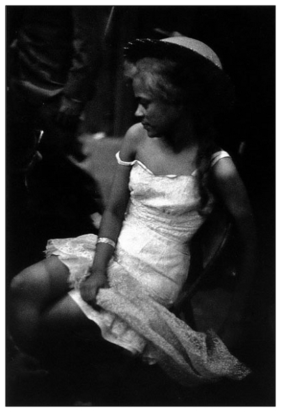 然而他的作品更多的是摇楞于摆拍和抓拍之间,让人揣摩不定。比如在一幅画面中(如图2所示),一位优雅的年轻女子,懒散地坐在一张廉价的折叠椅 子上,避开我们的视线,似乎转向画框外的一个男人。她的双腿交叠,有着可以辨认的华贵的服饰。她的右手撩起轻薄的丝绸衣裙,却像是紧抓着一个工具。衣裙一 侧的肩带垂落,将目光引向柔和的肌肤。她是一个有意为拍摄时装出现的女装模特?还是一个醉酒的女郎在等待夜总会的水手?