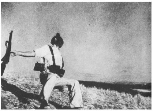 罗伯特·卡帕 罗伯特·卡帕是匈牙利人,1913年生于布达佩斯,原名安德烈,卡帕是他的笔名。他17岁时就立志要当摄影家,在柏林大学求学后,先在柏林一家通讯社做暗房工作,后到巴黎当记者。由于他的摄影作品受到一家摄影杂志社的重视,他便被委派到战地进行采访。 1936年西班牙内战,卡帕在西班牙战场拍摄了一个战士中弹将要倒下,这幅使人有身临其境之感的作品以《西班牙战士》、《战场的殉难者》、《阵亡的一瞬间》等标题发表,立刻震动了当时的摄影界,成为战争摄影的不朽之作,也成为卡帕的传世之作。