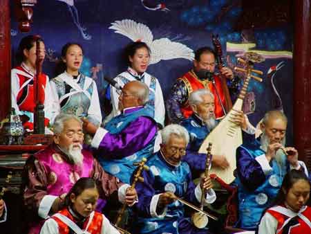 纳西古乐 纳西古乐由《白沙细乐》、《洞经音乐》和皇经音乐组成(皇经音乐现已失传),融入了道教法事音乐,儒教典礼音乐,甚至唐宋元的词、曲牌音乐,形成了它独特的灵韵,被誉为“音乐化石”。 纳西古乐的组成 纳西古乐的魅力渊源流长,是除了纳西语歌曲《纳西净地》之外,最能最打动纳西族同胞的音乐,另一个原因还是因为,纳西古乐是唐明皇等皇室贵族创作的宫廷音乐,是世界上最古老的音乐之一。纳西古乐主要由两部分组成: 1.《白沙细乐》 纳西族先民在约七百多年前创制的《崩石细哩》,汉译为《白沙细乐》,是流传在丽江纳西族乡间中的一种古典音乐技术形式,《白沙细乐》里有歌,也有舞,但它的主要成份是器乐合奏。《白沙细乐》用于丧事或是重大的祭祖节的活动中进行奏乐,是一部风俗性的音乐套曲。当时更有专门的乐工,其演奏技艺相当高超。后来演奏者多为半职业的民间艺人,受人邀请时参加演奏活动。该场演出背景音乐播出了广受纳西老百姓好评的歌曲《纳西净地》的部分片段,很有震撼感染力。 根据地方志史料,在十九世纪中叶,即距今二百多年以前丽江便流行着《白沙细乐》了,并且当时就说是在元朝流传下来的音乐。据1962年丽江县宣传部关于《崩石细乐》的调查,该乐曲共计有《笃》,《一封书》,《三思吉》,《阿哩工金拍》,《幕布》,等十四首。 《白沙细乐》在解放前夕已于云消失传。解放后,党和政府对《白沙细乐》十分重视,前后曾有十多起学习,采访和搜集整理活动1956年丽江县文化部门还组织了一个业余民族乐队,参加昆明举行的“云南省民族,民间音乐舞蹈会演”,并获得一等奖。原中国音乐家协会主席吕骥称《崩石细哩》是“中国音乐的活化石”给予了一定的肯定。 2.丽江洞经古乐 丽江洞经古乐,它是中原道教与纳西族民间音乐相溶合的奇异乐种。历史悠久,在丽江纳西族民间中广为流传。它奇迹般保存了部分中原地区早以失传的唐,宋,元时期的词,曲牌音乐。 纳西古乐有着一套严格的传承方式,演奏者多为年老艺人,乐器也很古老。他们遵循以师带徒或父带子的方式,使古乐代代相传,并用工尺谱为媒介以口传心授的方法传教。师傅口唱工尺谱,一曲曲一句句地教,徒弟一曲曲、一句句地背。边背工尺谱边学习演奏一件乐器,然后逐渐实践,边学边奏,直至逐曲熟练。正是由于这种严格的传承方式,纳西古乐才得以流存至今。 纳西古乐会集古老乐曲、古老乐器和高寿艺人为一体,被誉为稀世“三宝”。古乐会演奏的乐曲历史悠久,古朴典雅,最早可追溯至唐代。而古乐会的成员中,有半数以上是年逾花甲的老艺人。乐队所用的古乐器有苏古笃、曲项琵琶、双簧竹管乐器波伯(芦管),还有竹笛、大提胡、中胡、小叫胡、三弦、五音云锣、中锣、小镲、铙、大钹、锣、板鼓、提手、木鱼、磬等等。 世界最古老的音乐之一 在丽江县纳西族的音乐文化中,有一种驰名中外的纳西古乐。据考证,这种古乐起源于公元14世纪,它是云南省最为古老的音乐,也是中国或世界最古老的音乐之一。纳西古乐是纳西族人民在接受以儒道文化为代表的中原文明影响下而创建的艺术结晶。 纳西古有三个特点:一是曲目(音乐)古老,二是乐器古老,三是演奏的人老,大部分都是七八十岁的老年人(但近年也有少数青年知识分子热衷于纳西古乐)。听过这种三老古乐的人们不仅会感到纳西古东的古老和文明,而且还能体味到西族文化的博大精深。纳西古乐虽然古老,但500多年来却久盛不衰。其原因是它庄重黄雅,是一种高雅的文化艺术。对此,它不仅深受纳西族人民的喜爱,而且也受到了世界许多国家的青睐。 1995年10月,丽江纳西古乐队应邀赴美国、比利时、荷兰访问演出,一度轰动了西欧,美国、英国、意大利等国,其广播公司在黄金时间大量播放了丽江纳西古乐;荷兰、日本等国专家或考察团还专程到丽江考察古乐,并著有专著。 古乐流传 这种音乐在全国早已失传,因为它是一种道教经腔音乐(其它地方尚有零星存活)与儒家“雅集型细乐”的有机结合。元代以来的“细乐”是相对与“大乐”(粗乐)而言的;是相对于用不用唢呐而言的。“细乐”是儒家雅集型丝竹乐。这种不用唢呐的“丽江洞经音乐”则是区别于我国各地道乐体系的艺术珍品。其所以珍贵,是因该乐还保留了一部分在中原早已失传的辞、曲音乐。而这些曲调的歌词,如《水龙吟》、《浪淘沙》、《山坡羊》等则仅作为文学欣赏的古典汉语教材保留着,也就是说旋律本身早已失传。如《水龙吟》,原名《龙吟曲》,为北齐(562~ 565年)尚书郑述祖作:“……述祖能鼓琴,自造《龙吟十弄》……当时以为绝妙。”它是一首五弦古琴乐曲(《北齐书》卷26中的《郑述祖传》)。在盛唐时期李白(701~ 762年)《宫中行乐词》“笛奏龙吟水”句,又证唐时已将古琴曲改为笛子独奏曲《水龙吟》。而洪武十五年(1382年),皇帝朱元璋亲自重修了燕乐(通宴乐)中的《宴享九奏》,包括迎膳,进膳曲《水龙吟》。第二年(1383年)丽江土司木得(阿甲·阿德)到南京觐见朱元璋,就是说,木得72岁时在南京皇宫里受到款待。当时在皇宫进膳中听到进膳音乐《水龙吟》,皇帝还亲授木得“诰命”,并赐“诚心报国”银字金带一条、银牌令一面、金元宝六个(最高奖)、衣冠全服(见《皇明恩论录》、《明史·云南上司传》和《木